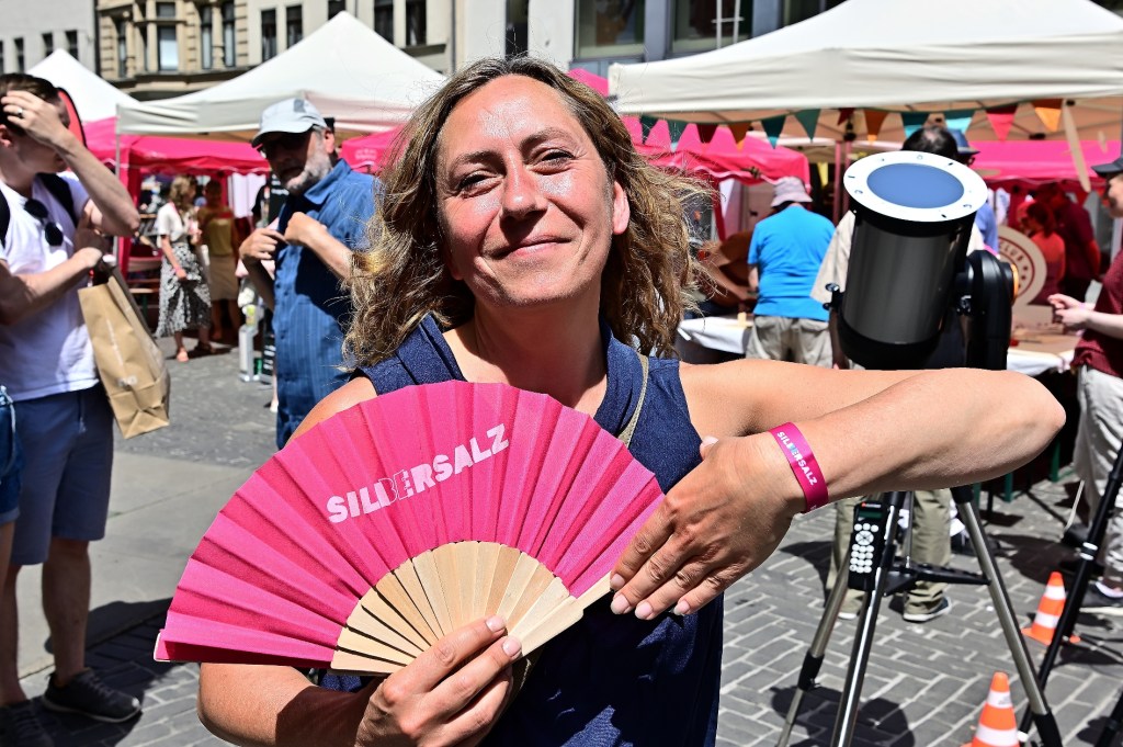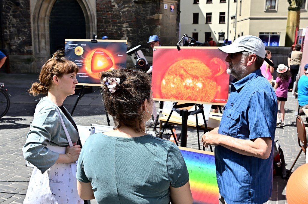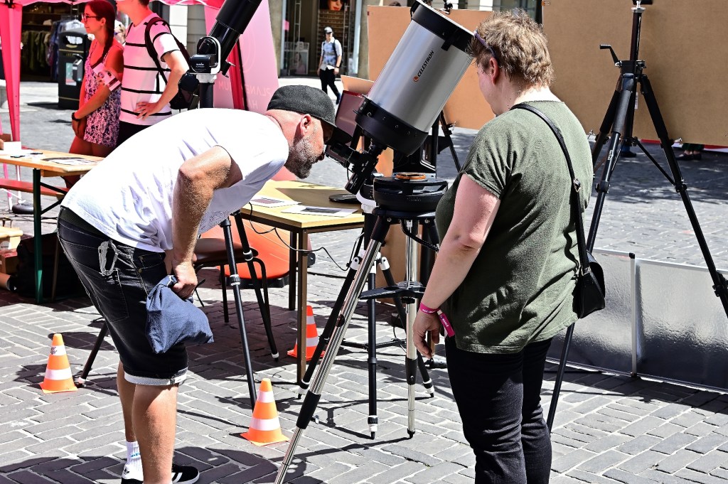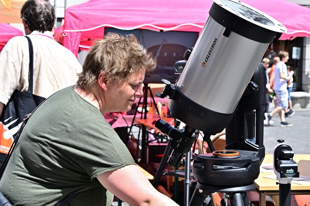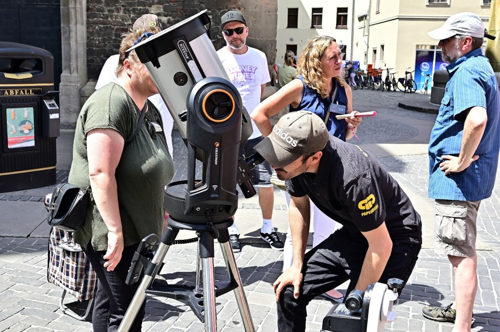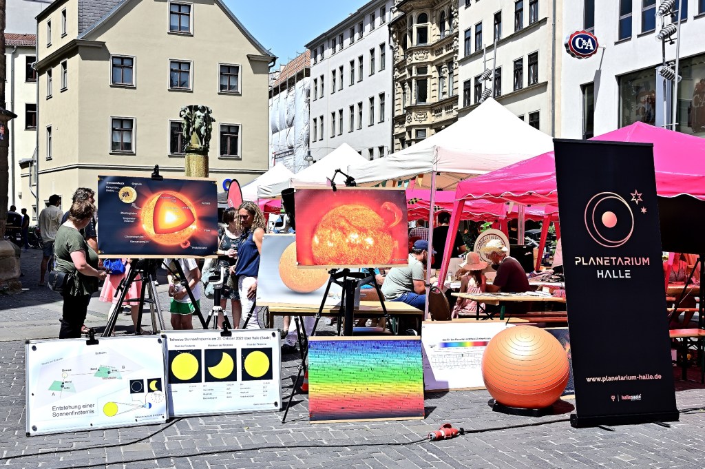 Es hat den Anschein, als wäre die Sonne heute etwas näher an unserer alten Erde. Wenn es um die heutigen Temperaturen von 35 Grad Celsius geht, allemal. Im Rahmen des Silbersalz-Festivals in Halle hatte sich heute auch das Team vom Planetarium Halle vor der Ulrichskirche in der Leipziger Straße mit Technik und Schautafeln aufgestellt. Interessierte hatten die Möglichkeit, die Sonne durch ein Teleskop mit entsprechendem Schutz für die Augen zu betrachten. Zu sehen ist dabei ein weißer Kreis mit Sonnenflecken. Nach Aussage von Dirk Schlesier, dem Leiter des Planetariums, sind die Sonnenflecken zwar winzig anzusehen, aber dennoch größer als unser Planet Erde. Solch einen Anblick ließen sich viele nicht entgehen.