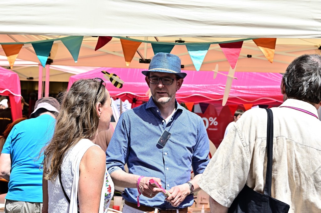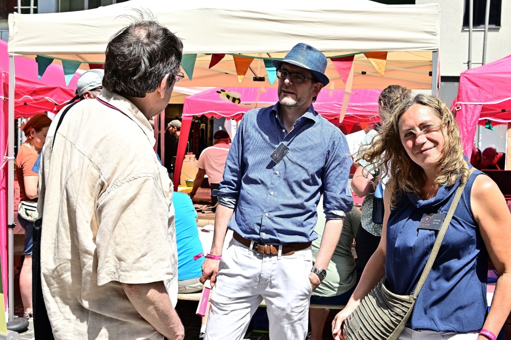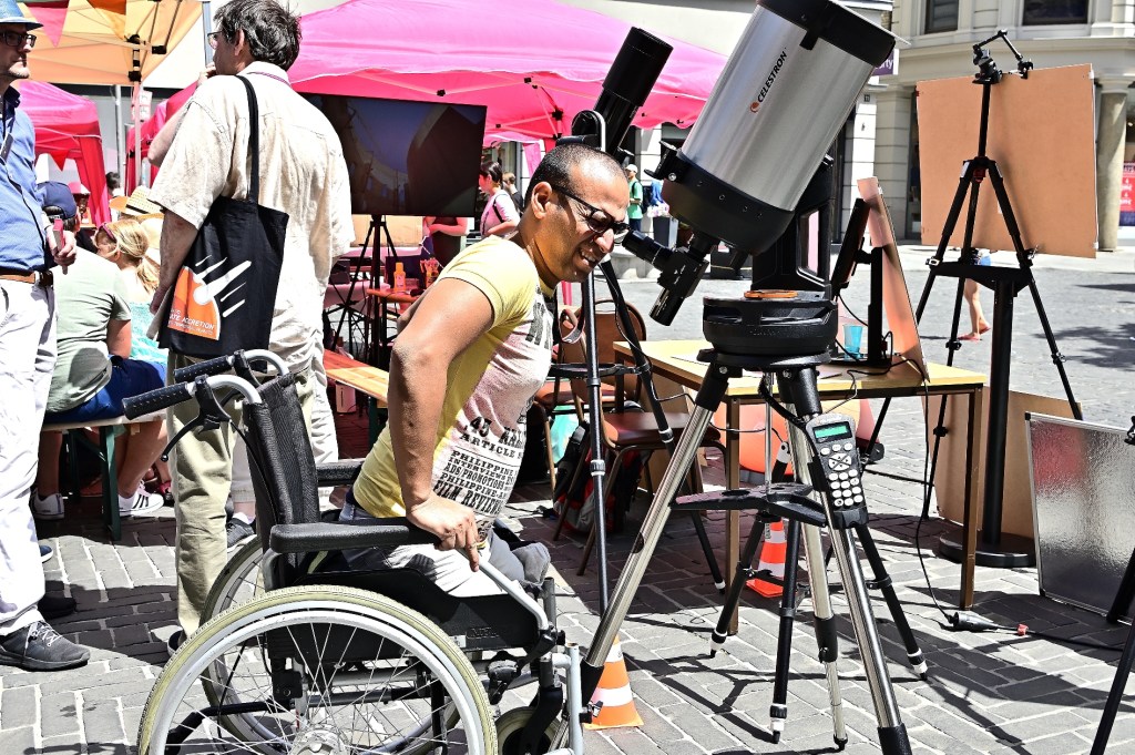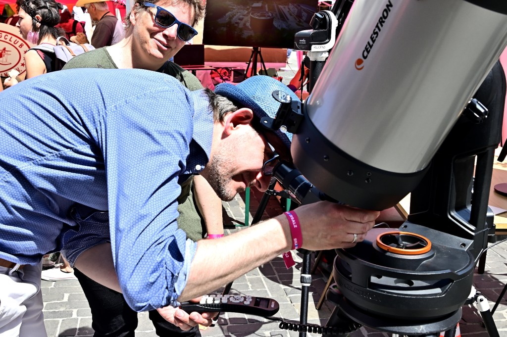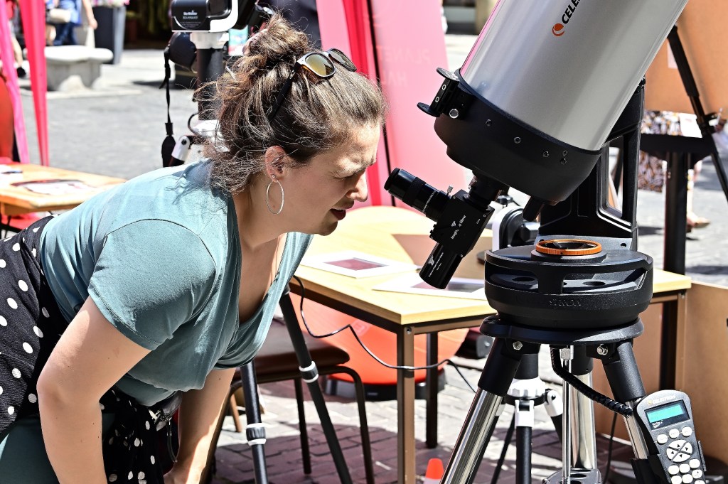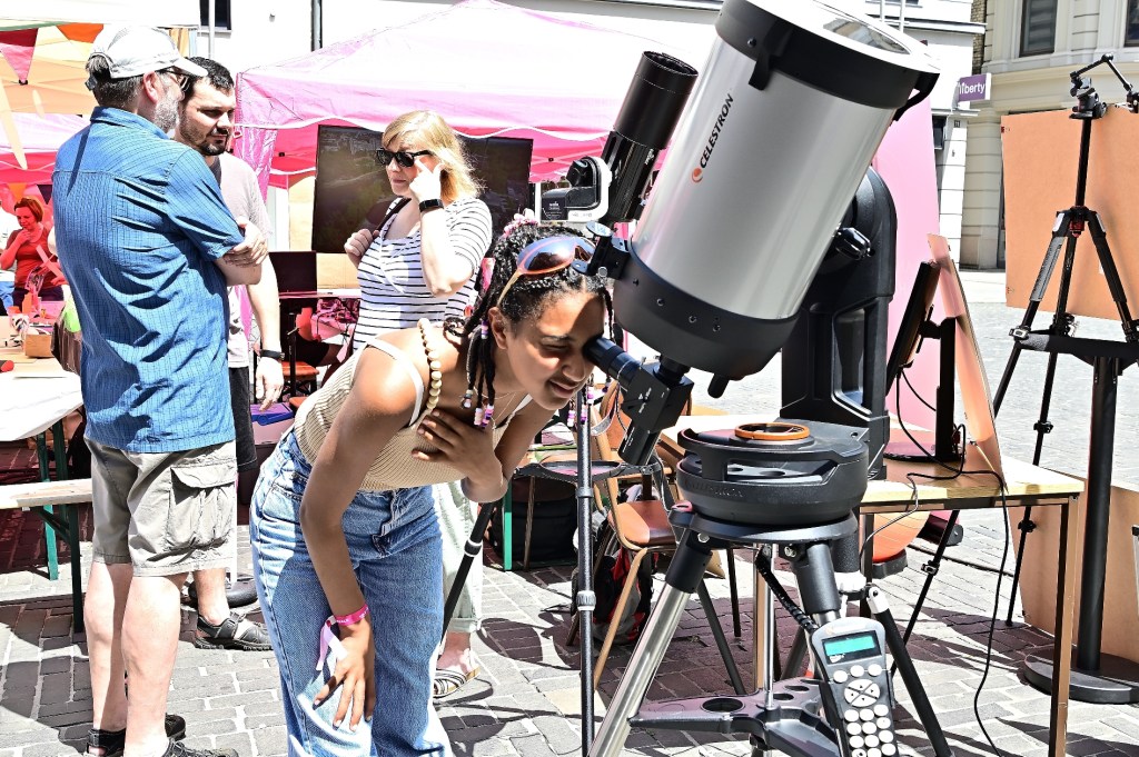 Es hat den Anschein, als wäre die Sonne heute etwas näher an unserer alten Erde. Wenn es um die heutigen Temperaturen von 35 Grad Celsius geht, allemal. Im Rahmen des Silbersalz-Festivals in Halle hatte sich heute auch das Team vom Planetarium Halle vor der Ulrichskirche in der Leipziger Straße mit Technik und Schautafeln aufgestellt. Interessierte hatten die Möglichkeit, die Sonne durch ein Teleskop mit entsprechendem Schutz für die Augen zu betrachten. Zu sehen ist dabei ein weißer Kreis mit Sonnenflecken. Nach Aussage von Dirk Schlesier, dem Leiter des Planetariums, sind die Sonnenflecken zwar winzig anzusehen, aber dennoch größer als unser Planet Erde. Solch einen Anblick ließen sich viele nicht entgehen.