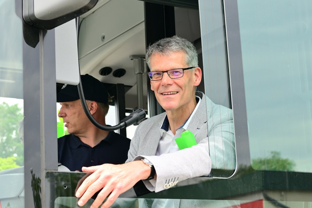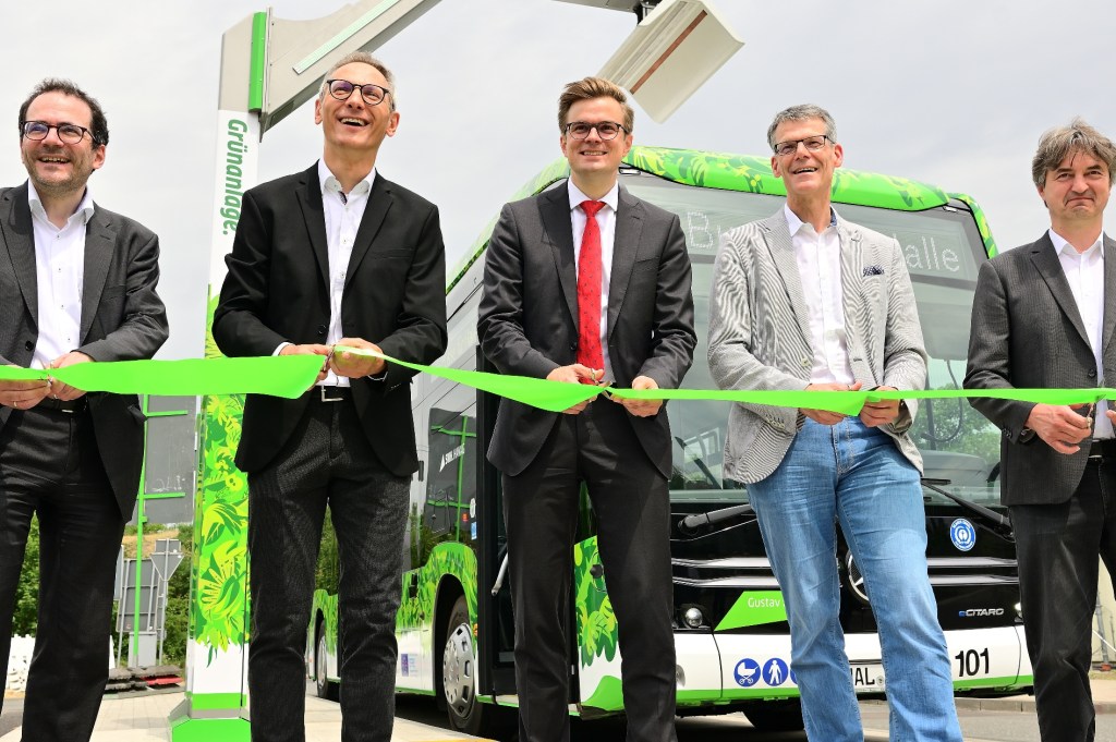 Ab heute fahren drei neu E-Busse im städtischen Linienverkehr ausschließlich mit Öko-Strom. Egbert Geier, Bürgermeister der Stadt Halle (Saale), Sven Halle, Staatssekretär im Ministerium für Infrastruktur und Digitales, Matthias Lux, Vorsitzender Geschäftsführer der Stadtwerke Halle (Saale) und Vinzenz Schwarz, Vorstand der HAVAG durchschnitten heute gemeinsam an der Endhaltestelle in Kröllwitz symbolisch das Band zur feierlichen Inbetriebnahme der neuen Technik.