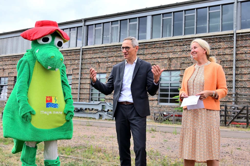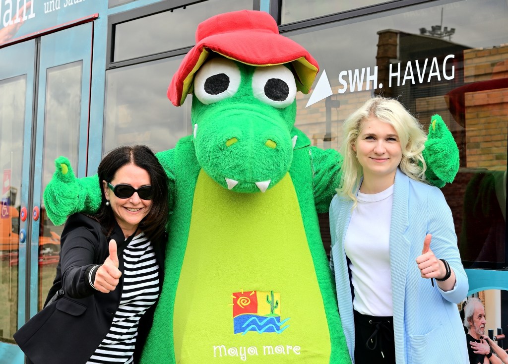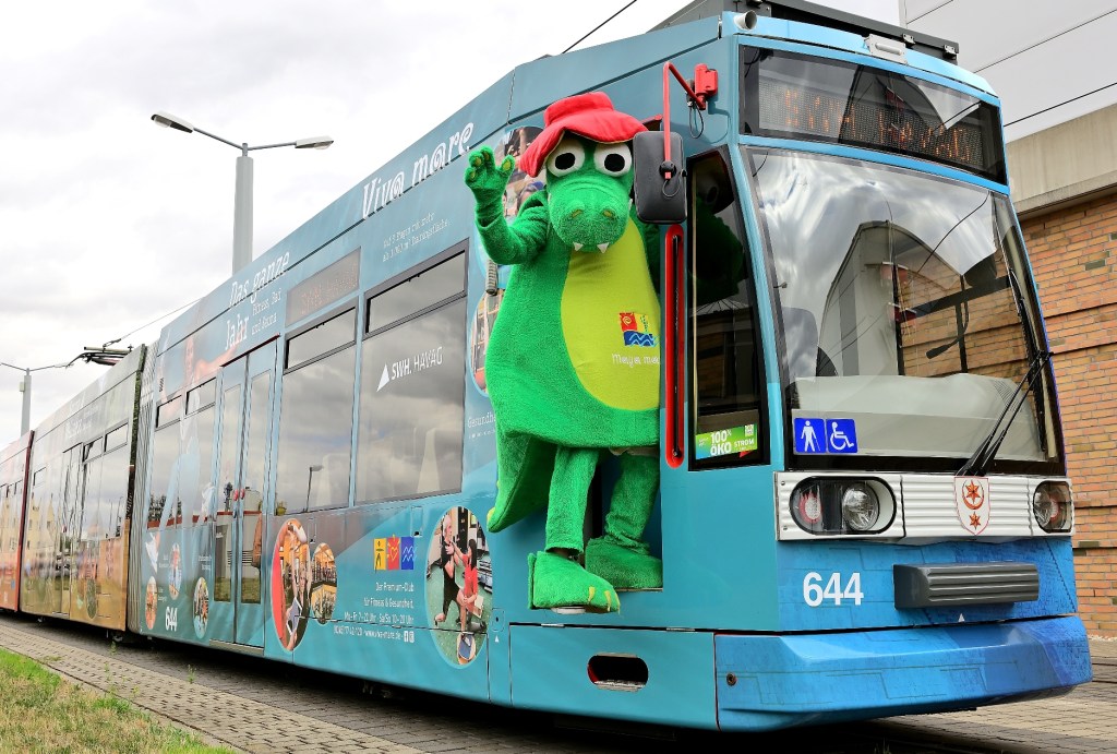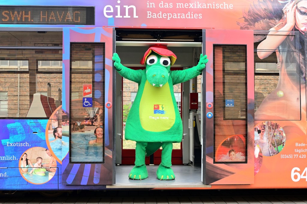 Seit 2008 ist die Maya mare-Straßenbahn in der Stadt unterwegs und informiert im „Vorbeifahren“ über Angebote des Freizeitbades. Eine Auffrischung der drei Waggons war angesagt. Heute wurde die Straßenbahn im Straßenbahndepot durch die Geschäftsführerin der Maya mare GmbH & Co. KG, Annette Waldenburger und Vinzenz Schwarz, Vorstand der Halleschen Verkehrs-AG vorgestellt und vom Maskottchen „MEX“ präsentiert.