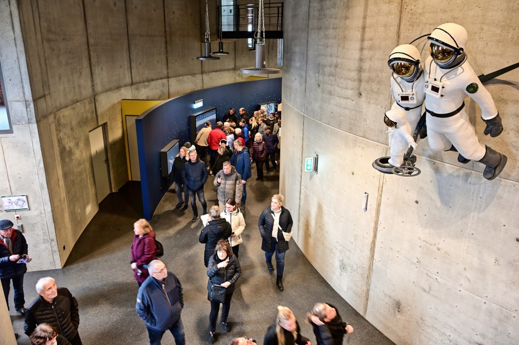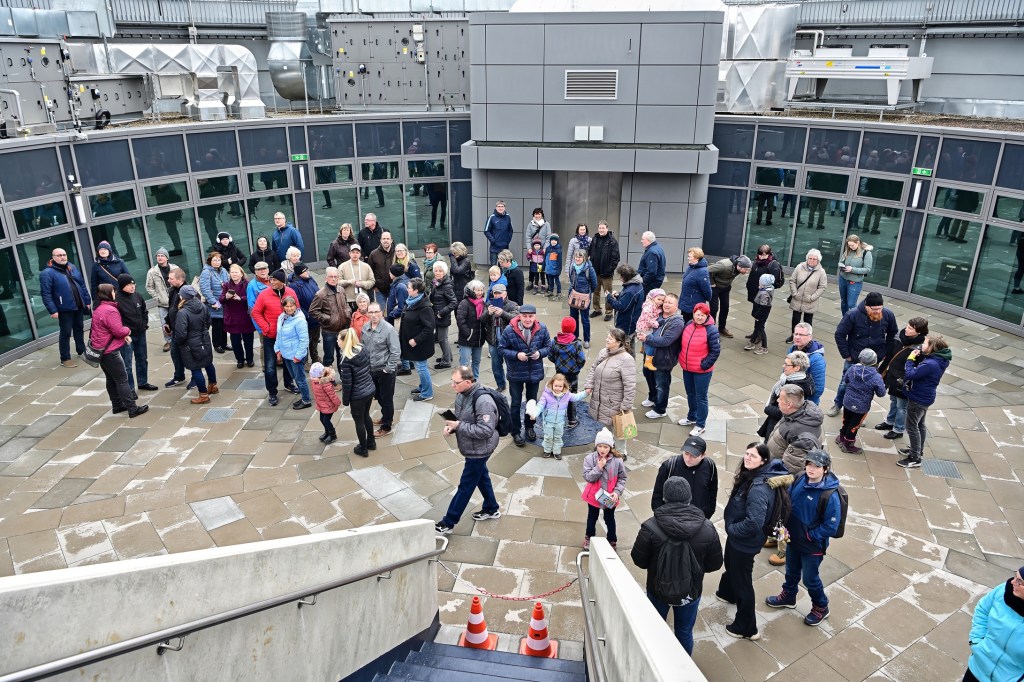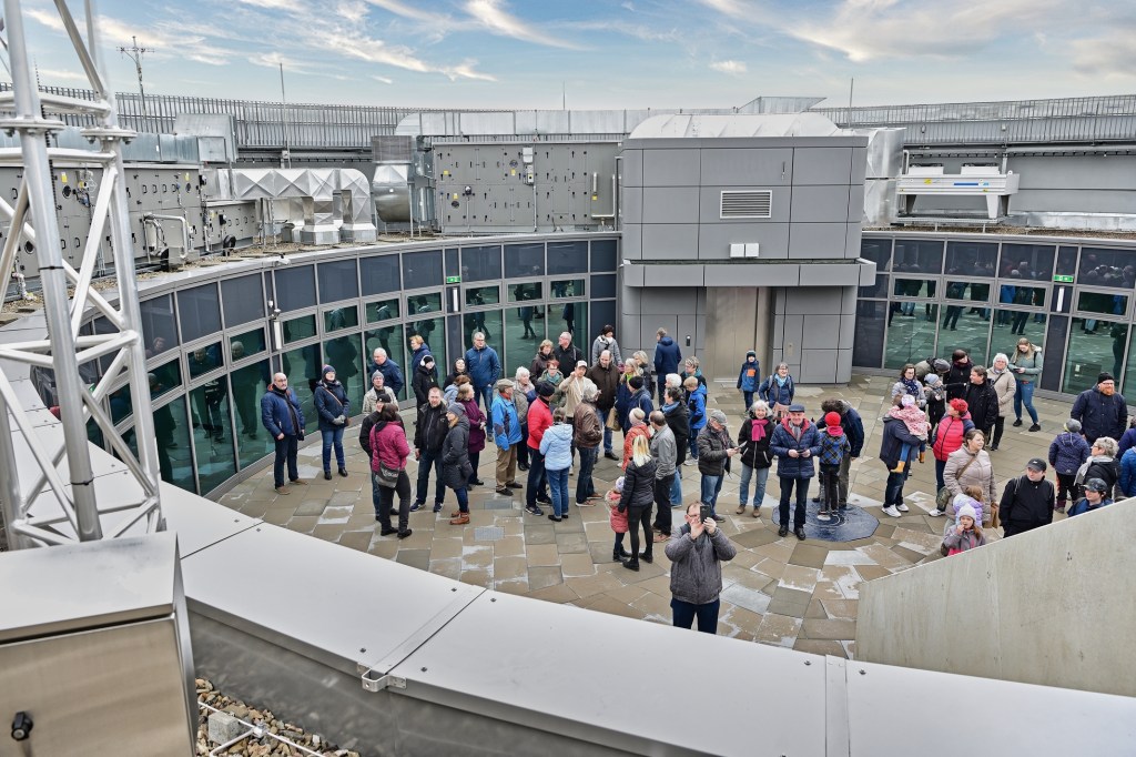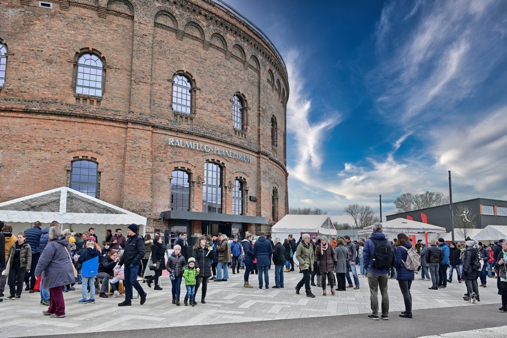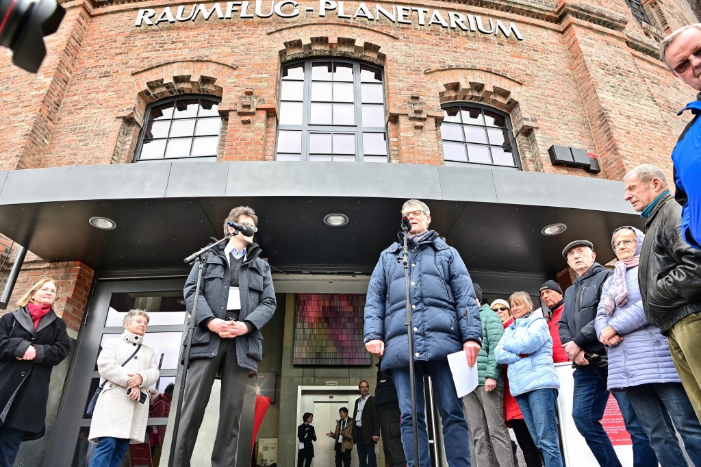 Am letzten Tag der viertägigen Eröffnungsfeier im Planetarium Halle war auf dem Vorplatz noch einmal richtig was los. Zum Familientag präsentierten sich Vereine und Nachbarn des Planetariums mit Aktionen für die gesamte Familie. Pünktlich um 14:00 Uhr wurden die Besucher von Bürgermeister Egbert Geier und Planetariumsleiter Dirk Schlesier begrüßt. Und dann strömten die vielen Zuschauer ins Planetarium. Staunende Blicke und Begeisterung waren die ersten Reaktionen, denn bis dahin konnte nur wenige hinter die Kulissen schauen, waren doch die Bauarbeiten und die Ausstattung des Planetarium hinter den hohen Mauern des alten Gasometers nicht einsehbar.