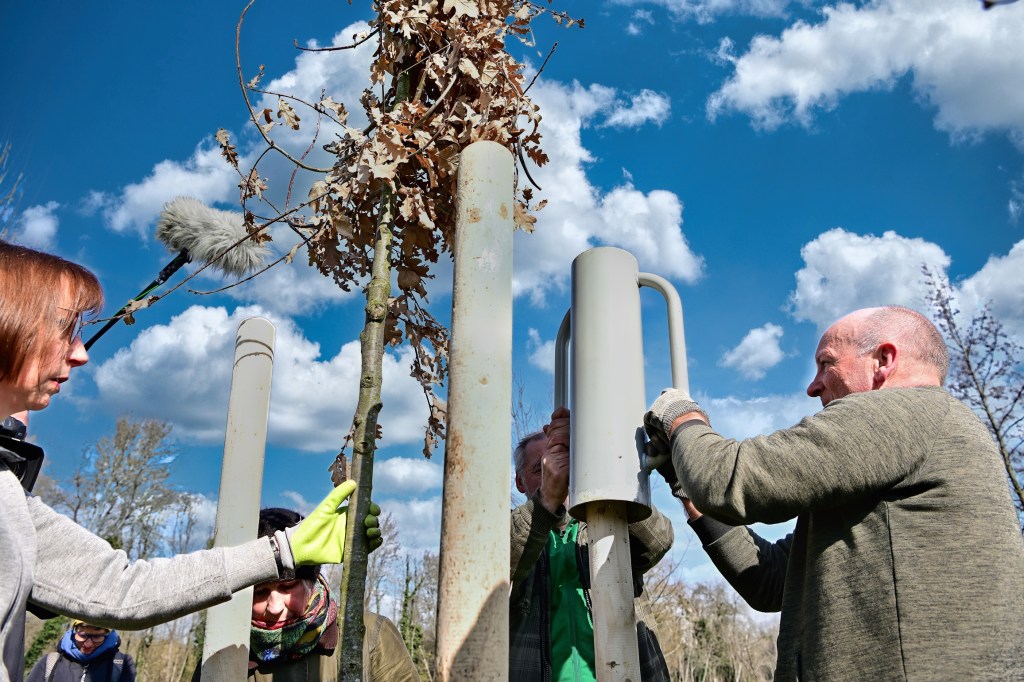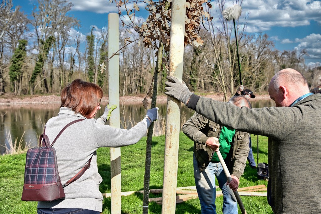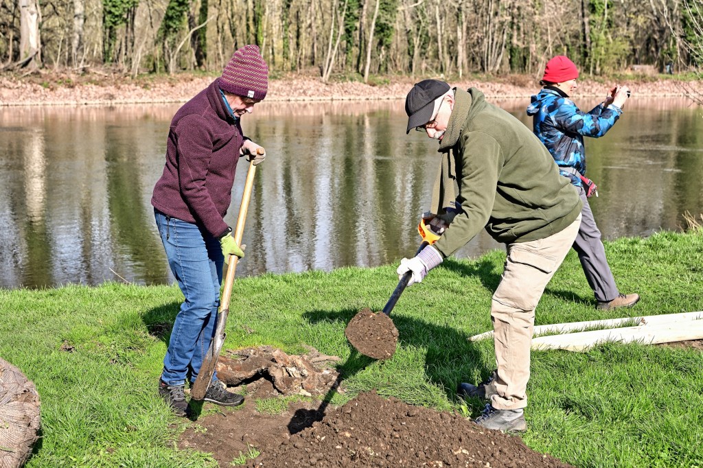 Es hatten sich ausreichend Helferinnen und Helfer eingefunden, die Pflanzlöcher sind schnell ausgehoben, der Boden ist relativ locker und für die ca. 6-8 Jahre alten und etwa 3 Meter hohen jungen Bäume, zwei Schwarzerlen und die eine Stieleiche gut geeignet. Damit alles schnell anwächst werden sie gut gewässert. Abschließend erfolgt die Sicherung für die nächsten Jahre.