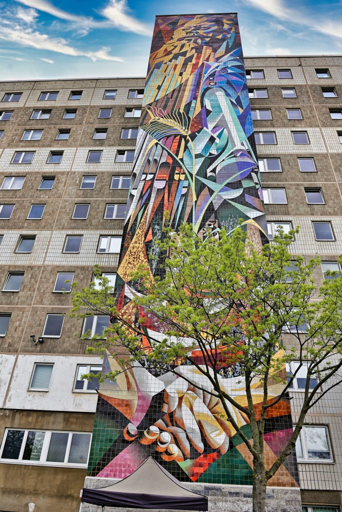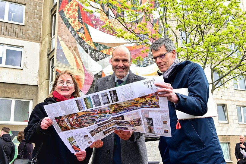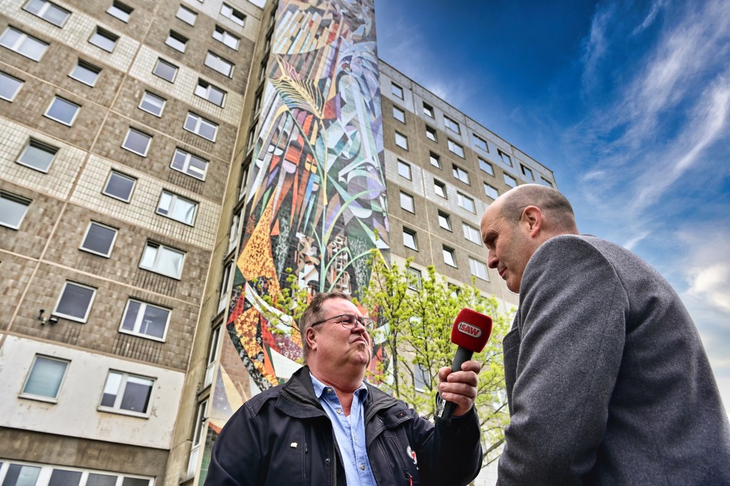 Mit der großen Medienresonanz hatten selbst die Veranstalter heute in Halle-Neustadt, Am Stadion 5, nicht gerechnet. Im Beisein des Bürgermeisters der Stadt Halle (Saale) Egbert Geier und der Beigeordneten für Kultur Dr. Judith Marquardt, wurde heute nach Durchführung einer denkmalgerechten Instandsetzung das Wandbild „Einheit der Arbeiterklasse und Gründung der DDR“ übergeben.