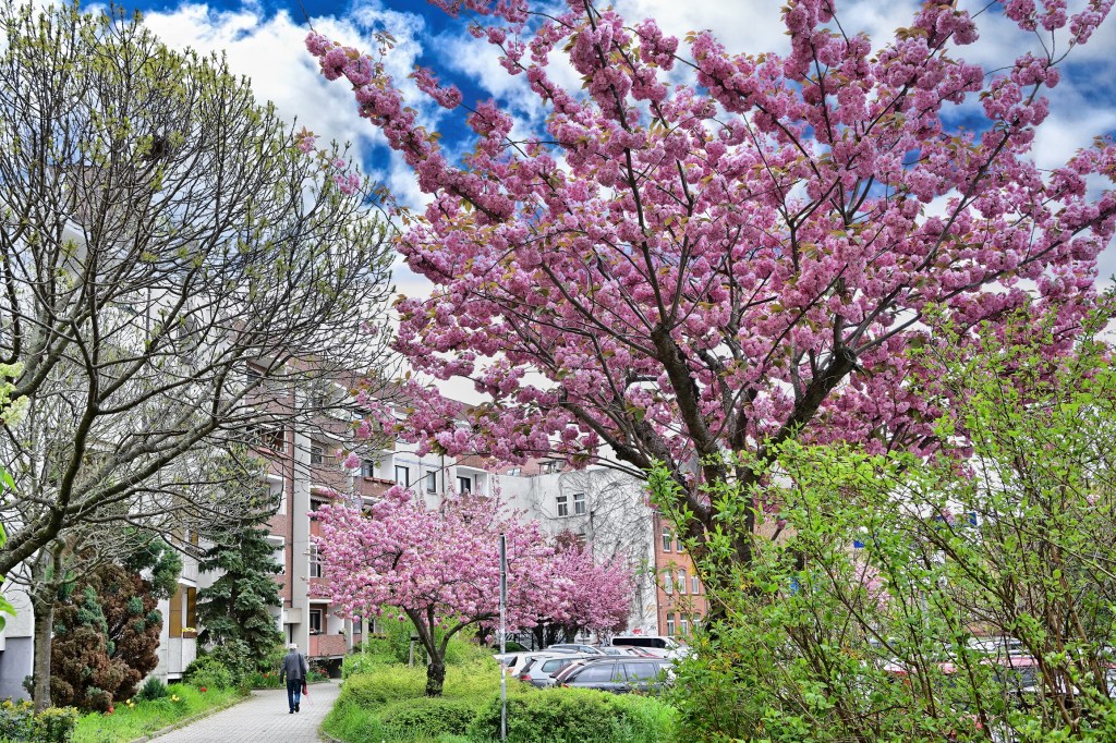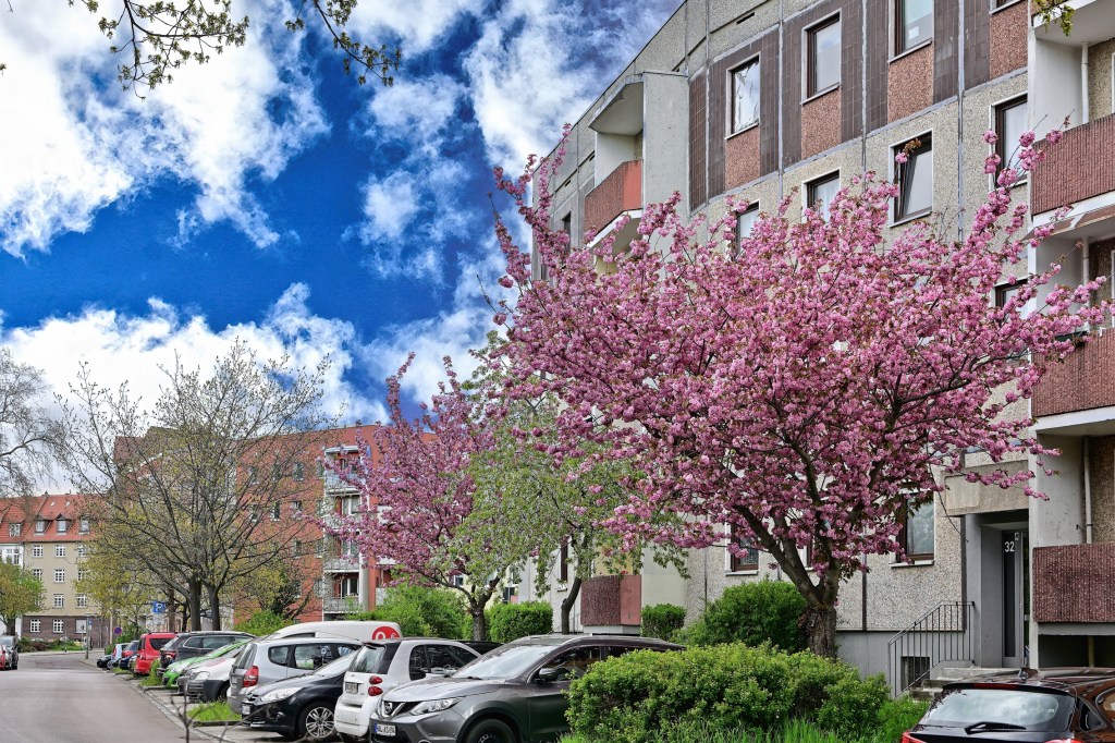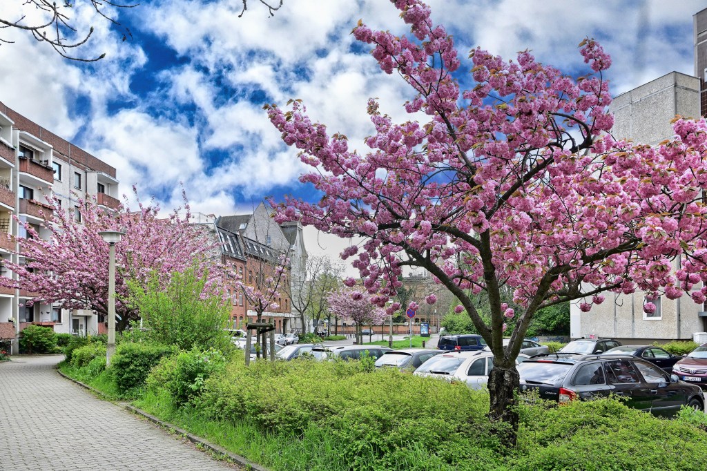 In der Großen Wallstraße in Halle blühen wieder die Kirschbäume. Seit Jahren stehen entlang der Straße mehrere japanische Nelkenkirschbäume aus der Gattung „Prunus“. Sie gehören zur Familie der Rosengewächse (Rosaceae). Sie blühen immer nur wenige Tage im Jahr, dafür geben sie sich in ihrer Farbepracht allergrößte Mühe.