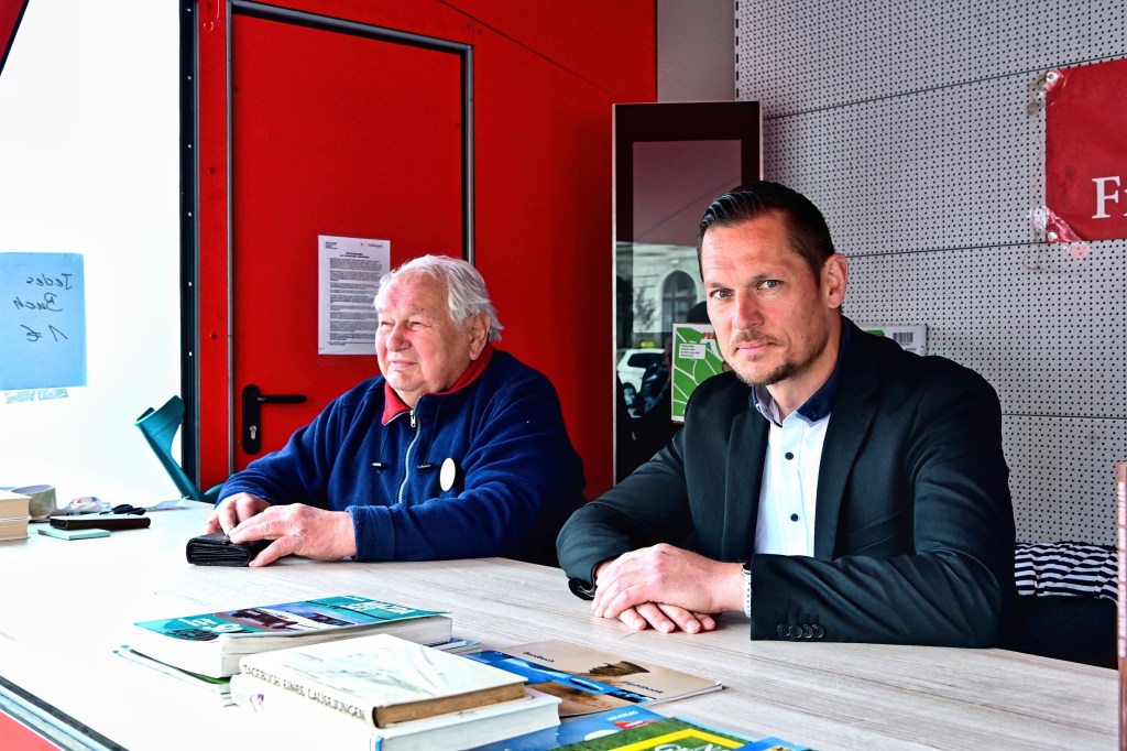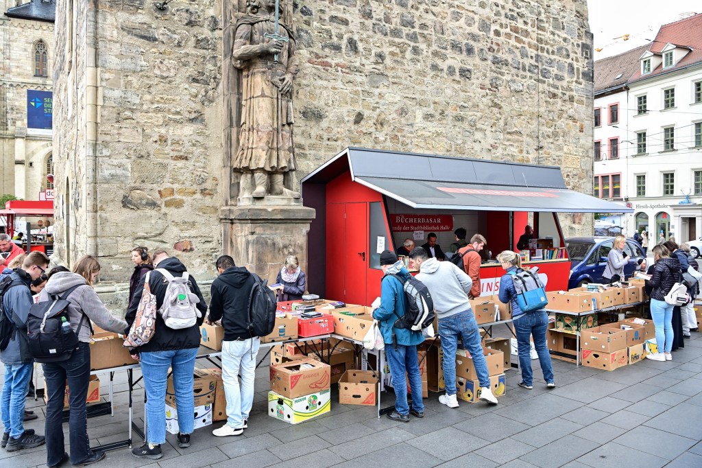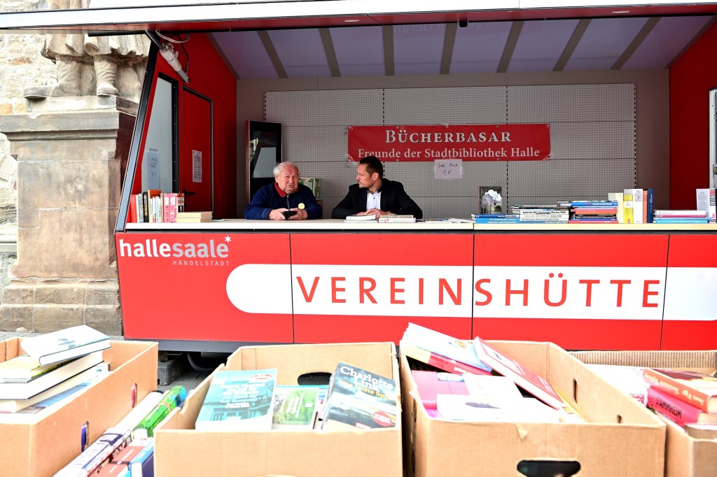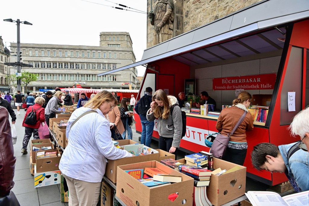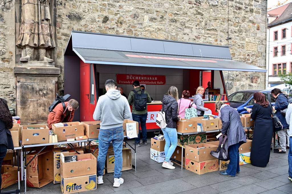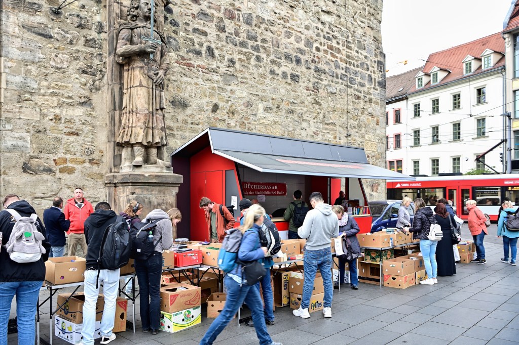 Aus städtischer Sicht erklärt Tobias Teschner, Leiter der Fachbereiches Sicherheit der Stadt Halle (Saale) das Anliegen: Es gab einen Vorschlag der Stadtbibliothek in Person von Herrn Kupke eine Vereinshütte außerhalb des Weihnachtsmarktes ganzjährig aufzustellen. Mit den Verantwortlichen der Stadt Halle (Saale) wurde das Anliegen geprüft und im Stadtrat diskutiert, wobei es auch kontroverse Ansichten dazu gab. Es wurde deshalb zunächst als „Testballon“ konzipiert und in den Sommermonaten aufgestellt. Die Vereine, die sich dabei auch im letzten Jahr für die Idee mit großer Kraftanstrengung einsetzten, haben insgesamt gute Erfahrungen gesammelt. Deshalb wurde entschieden, auch in diesem Jahr das Konzept „Vereinshütte“ fortzusetzen. Seit ca. 1 Woche steht die Hütte mittlerweile und wird bis September am Standort stehen bleiben. Sie kann von gemeinnützigen Vereinen kostenfrei genutzt werden. Wer sich also als Verein dafür interessiert, kann sich direkt an maerkte@halle.de wenden. Unter dieser Adresse wird die Vergabe koordiniert. Die Stadt würde sich freuen, wenn das Angebot rege genutzt wird. Die Idee der Umsetzung beginnt jetzt mit dem Büchermarkt, denn „lesen bildet“ und an dem großen Andrang am Stand kann man auch ableiten, es wird angenommen.