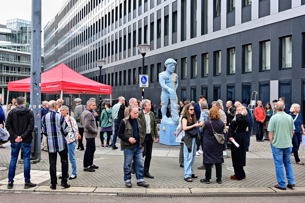 Zur Enthüllung des „Schweinehirten“ erschienen gestern zahlreiche Besuche, darunter viele bekannte Künstler der Stadt, wie Prof. Bernd Göbel, dessen eigenes Kunstwerk, der sogenannte „Göbel-Brunnen“ keine 30 Meter entfernt steht. Die Wahl des Standorts ist keineswegs zufällig. Dieser Ort ist ein Knotenpunkt, an dem Kunst und Kultur aufeinandertreffen. Theumer hat die Skulptur strategisch platziert, um die Besucher der Galerie einzuladen, eine Reise in die Vergangenheit zu unternehmen und sich gleichzeitig mit der lebendigen Kunstszene Halles auseinanderzusetzen.