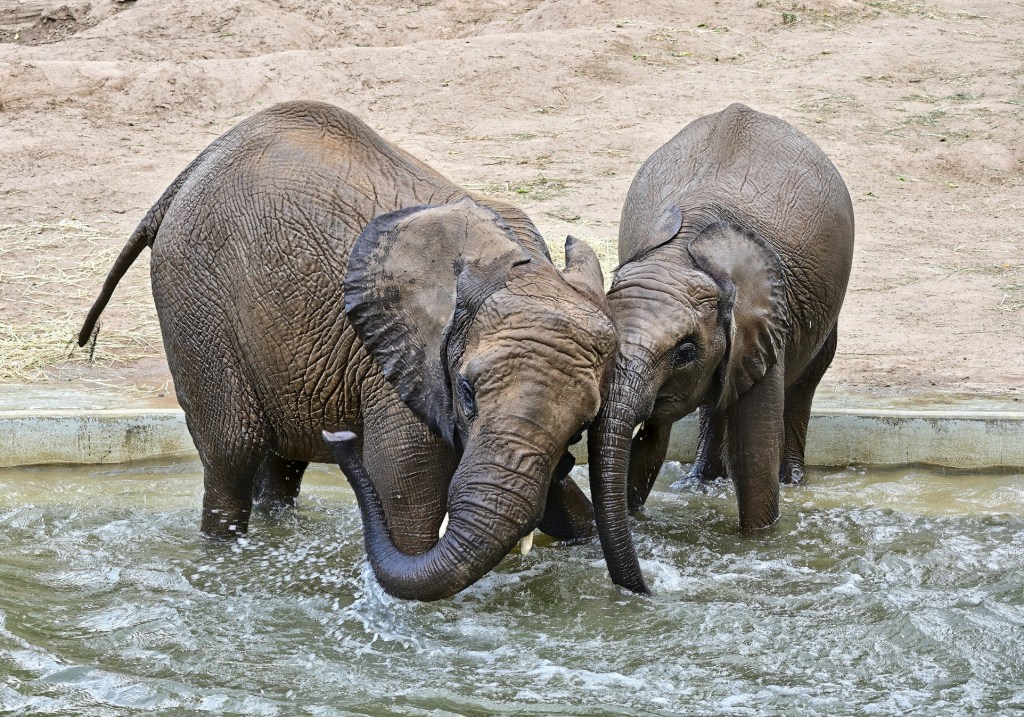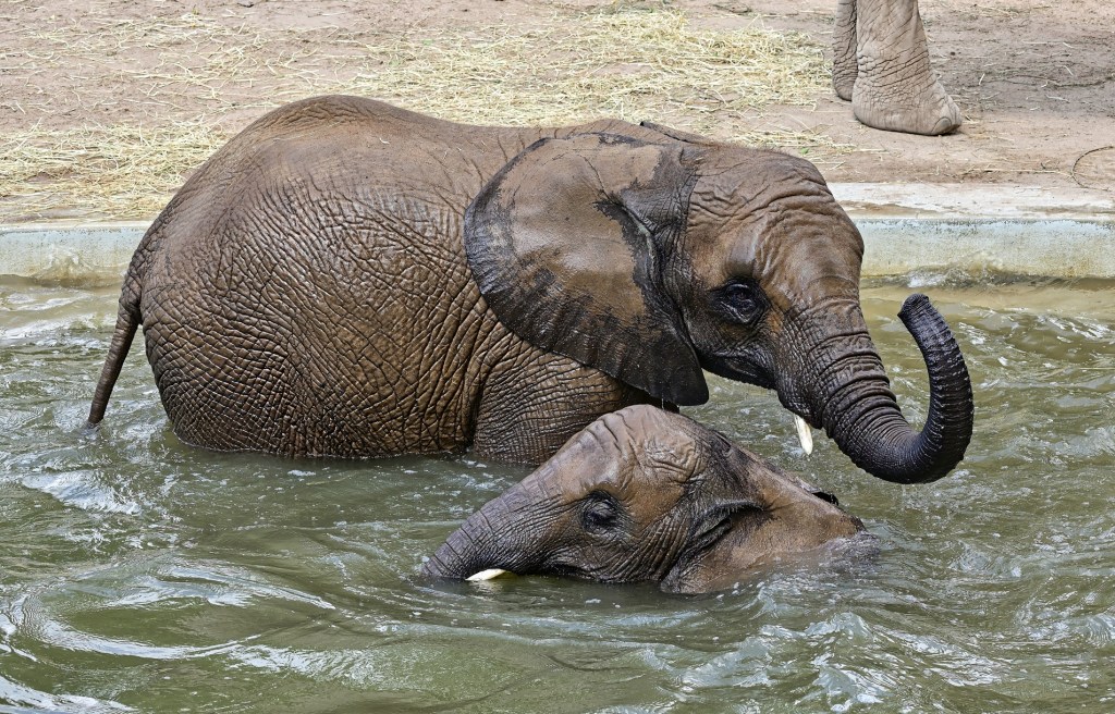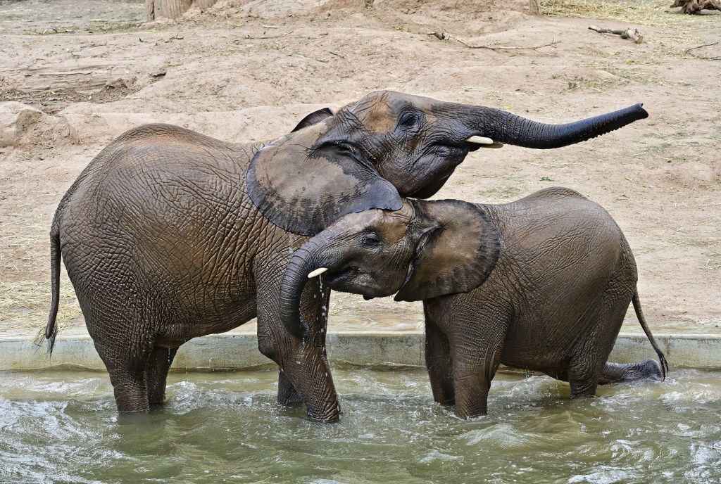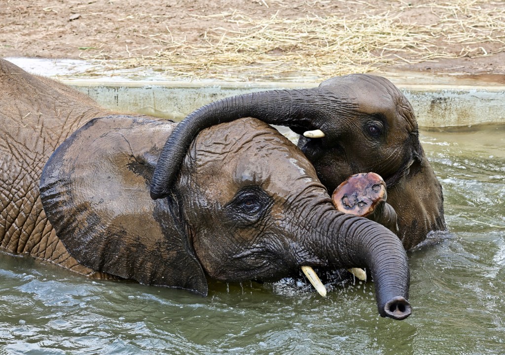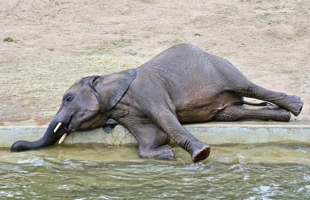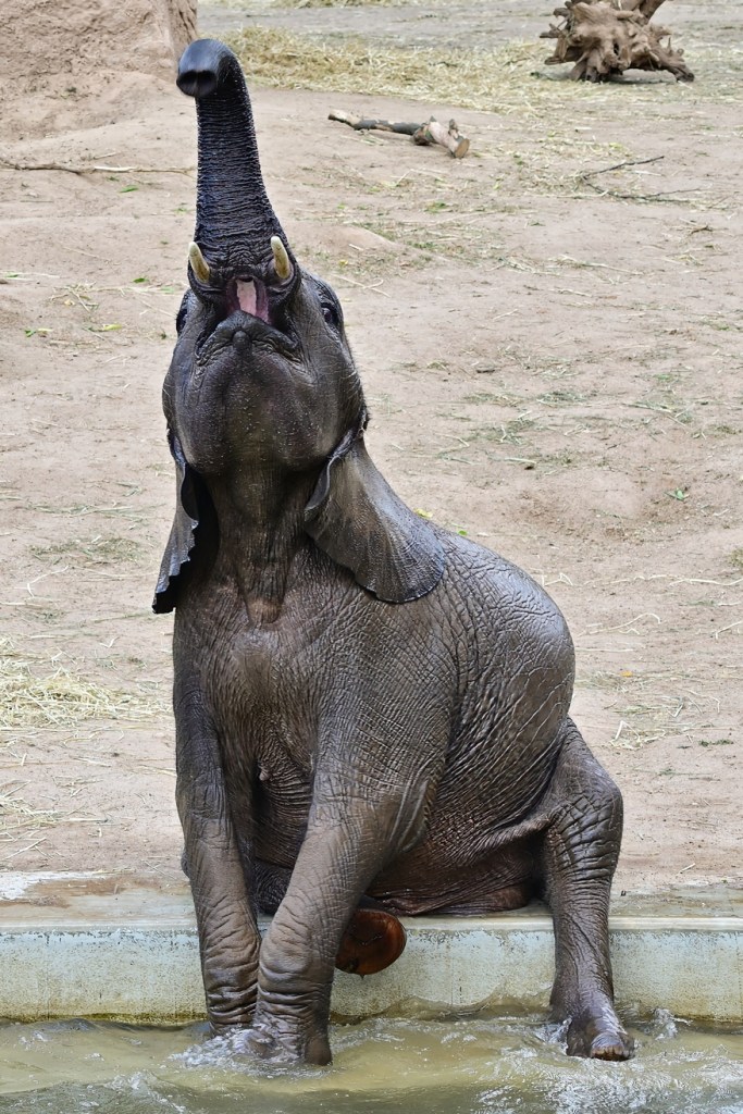 Nach der Übergabe der Patenschaftsurkunde für „Tamika – Die kleine Süße“, ging es gestern sofort zum Baden in den eigenen Pool im Außengehege der Elefanten im Zoo von Halle. Kurz abgekühlt und animiert zum Einstieg in den Pool war es die jüngste aus der Gruppe, Elani, die sofort ins Wasser ging, zusätzlich angefüttert durch Äpfel die von den Pflegern ins Wasser geworfen wurden. Und dann wurde den Zuschauern eine richtige Show geboten. Die Geschwister Tamika (7 Jahre) und Elani (3 Jahre) hatten sichtlich ihren Spass.