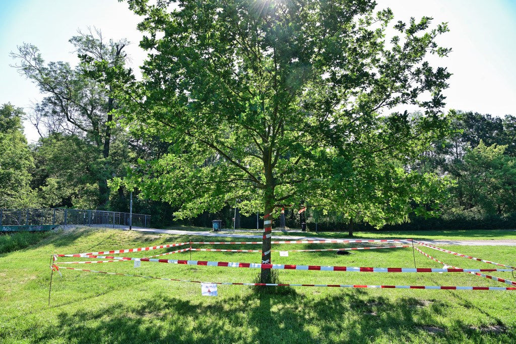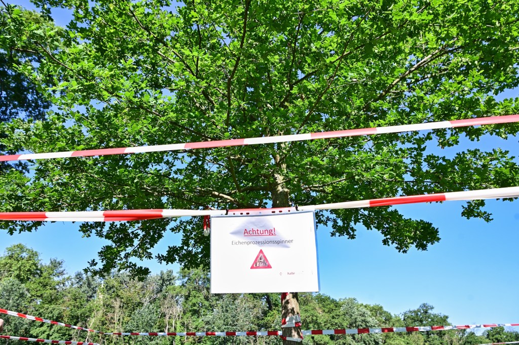 Die Stadt Halle (Saale) warnt die Bevölkerung derzeit vor den gesundheitlichen Risiken des Eichenprozessionsspinners. Ein junger Eichenbaum am Saaleufer, in unmittelbarer Nähe zur Mühlgrabenbücke – https://goo.gl/maps/E7bnPyfcFDNCYLS69 – ist aktuell davon betroffen. Das Areal ist sichtbar abgesperrt und zusätzlich von 4 Seiten mit Warnschildern versehen.