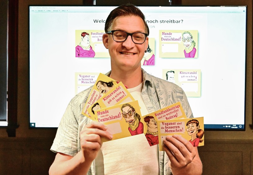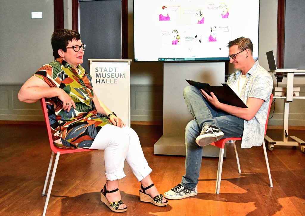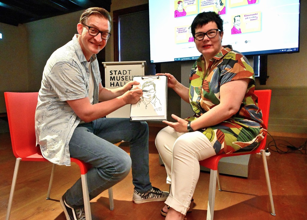 Bei der Veranstaltung wurde eine Motivreihe von fünf Postkarten präsentiert, die der hallesche Illustrator und Karikaturist Thomas Leibe speziell für das kulturelle Themenjahr 2023 unter dem Motto „Streitkultur und Zusammenhalt“ gestaltet hat.