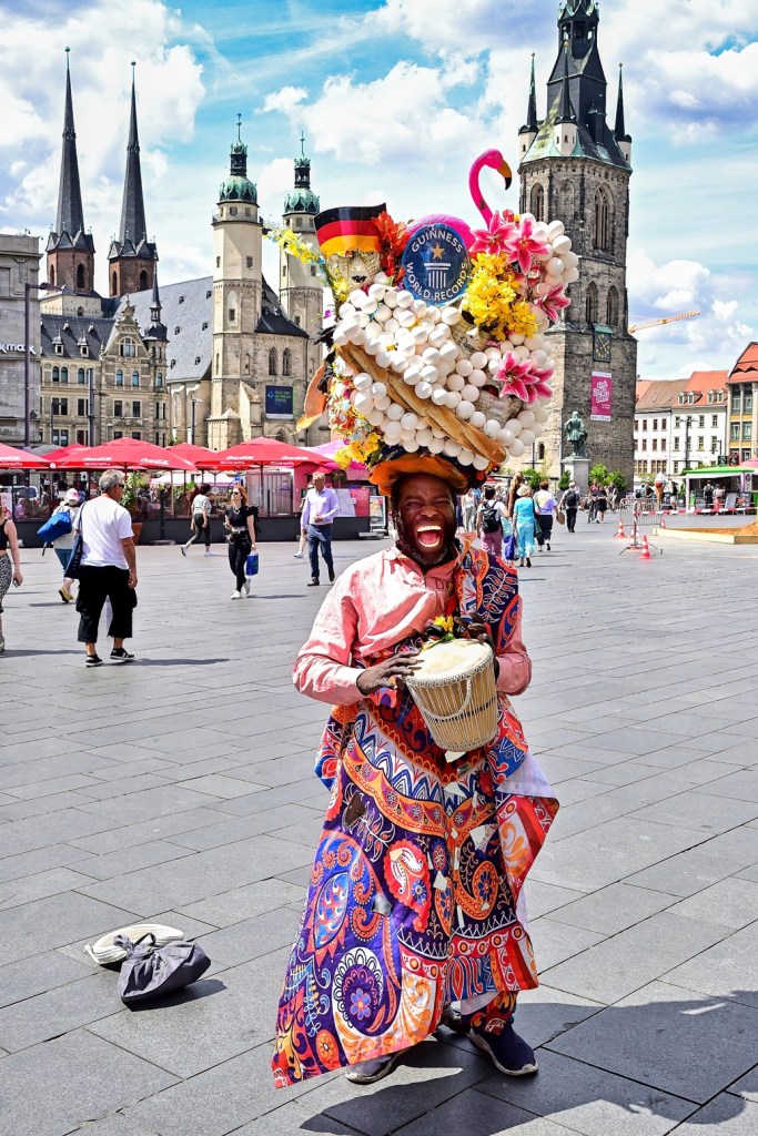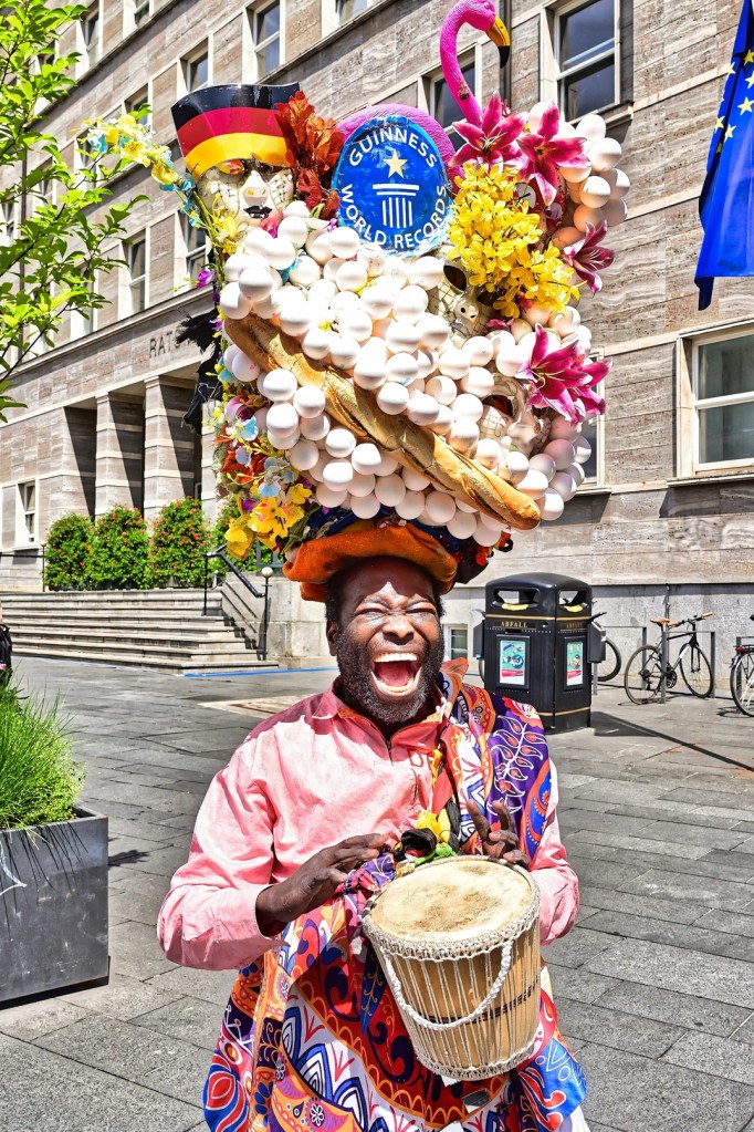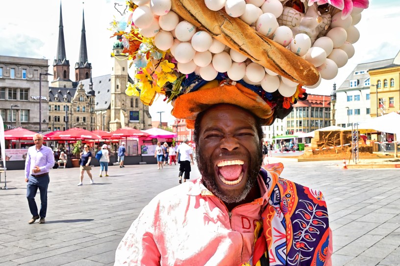 Da ist er wieder, mein Freund, der „Eiermann“. Gut gelaunt und mit 50 Kilogramm auf dem Kopf, steht er in der Einkaufsmeile in der Leipziger Straße und unterhält singend und tanzend die Passanten.
