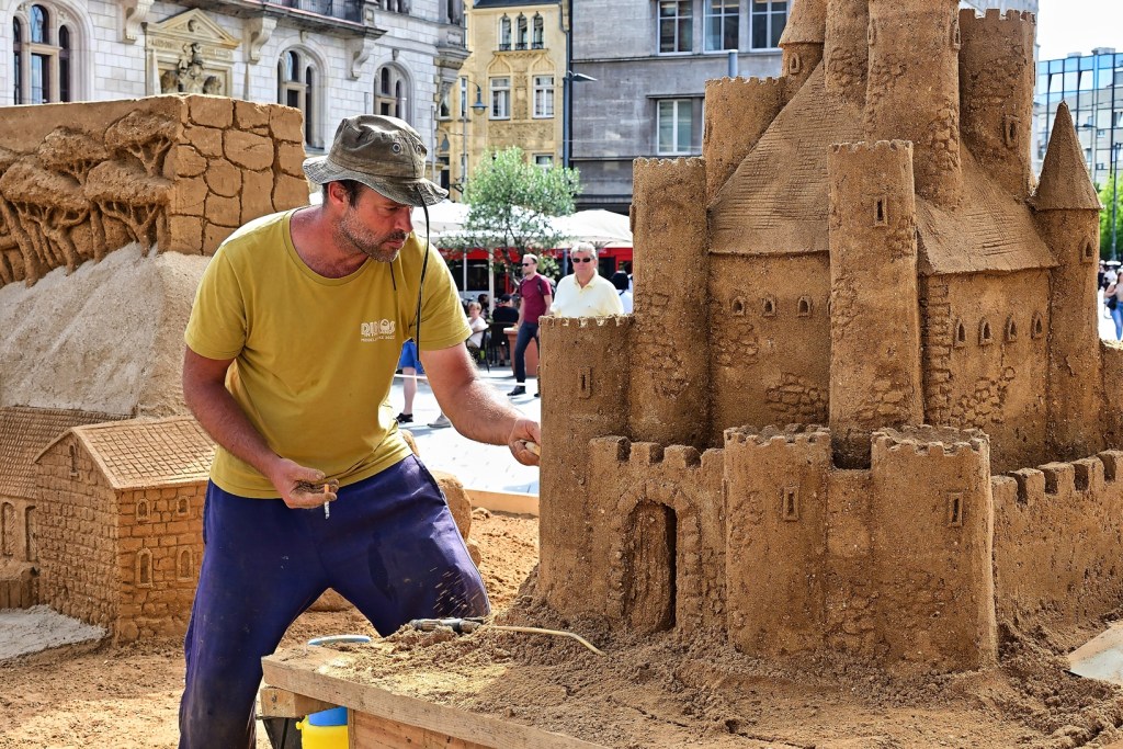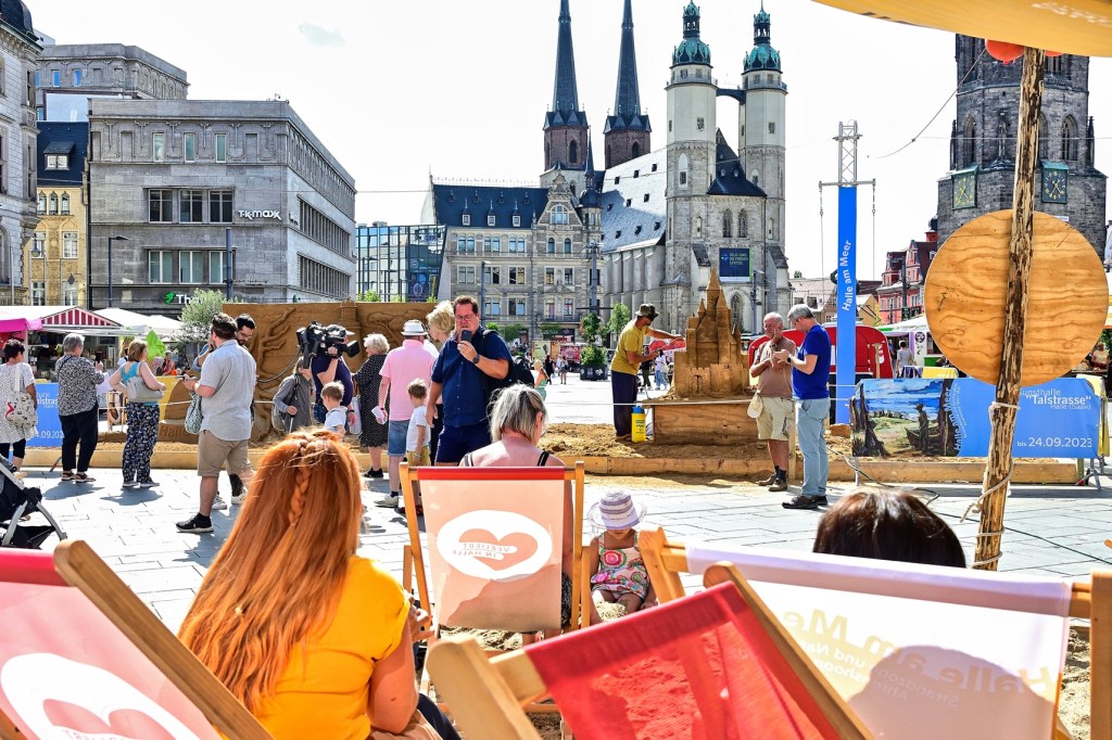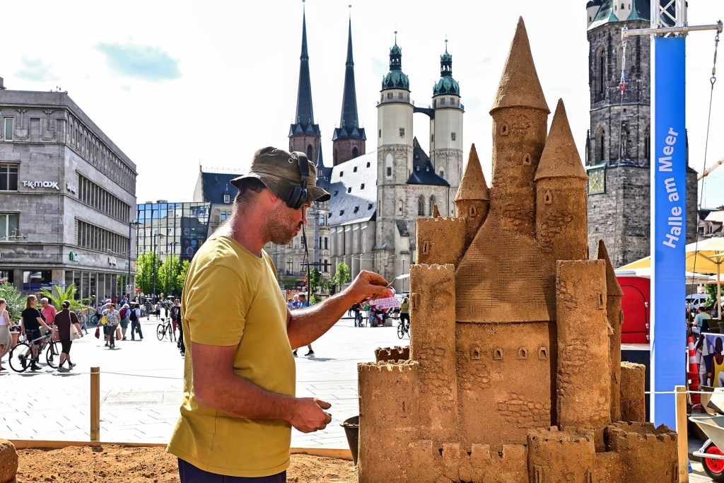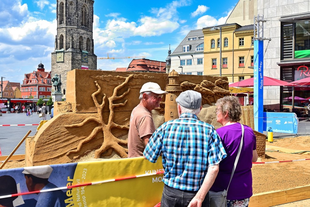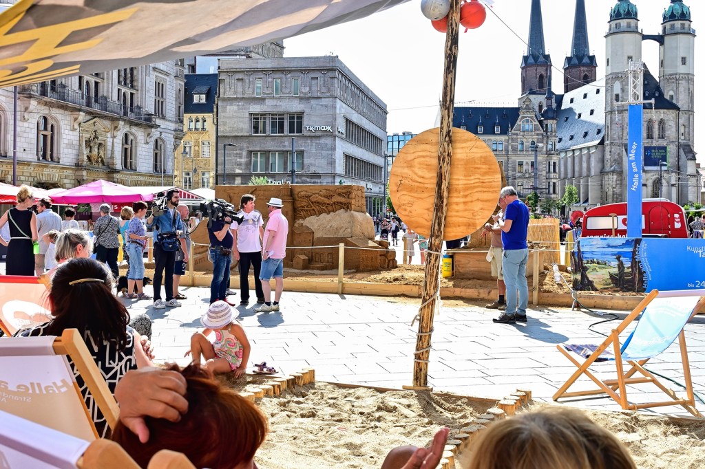 Sandskulpturen auf dem Marktplatz von Halle vermitteln Urlaubsgefühl.