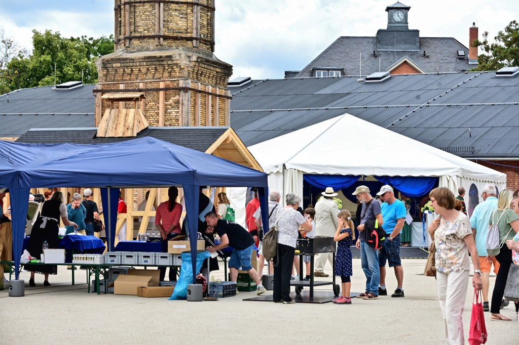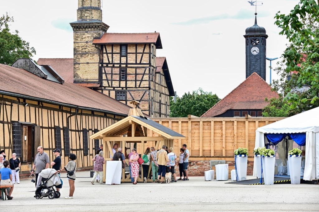 Pünktlich um 11:00 Uhr begann das Schausieden in dem neuen Siedehaus auf dem Hof. Die Halloren demonstrierten vor den Augen der Besucherinnen und Besucher die traditionelle Art der Salzgewinnung aus der Sole. Mit geschickten Handgriffen und jahrhundertealtem Wissen führten sie die einzelnen Schritte des Siedeprozesses vor. Die Siedepfanne wurden mit der Sole befüllt und über dem Holzkohlefeuer erhitzt, während der charakteristische Geruch von Salz in der Luft lag.