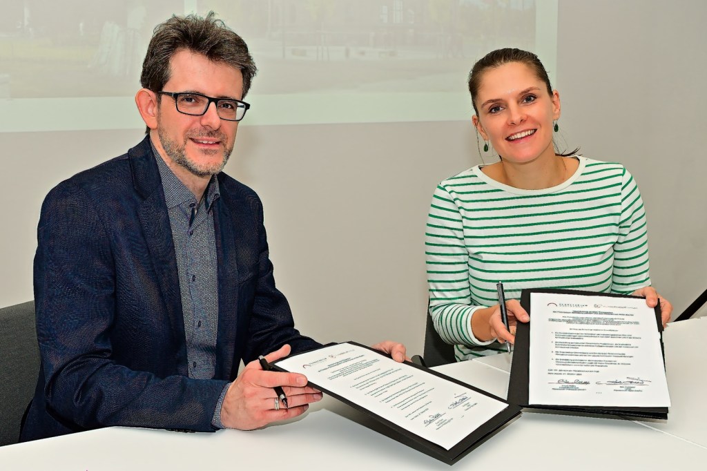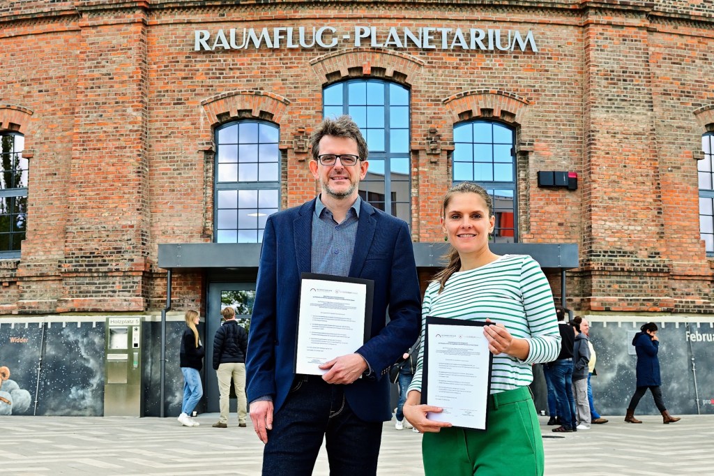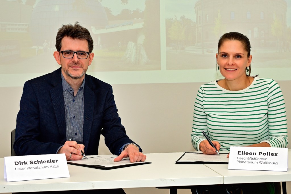 Schulterschluss zum Jubiläum: Der Leiter des Planetariums der Stadt Halle (Saale), Dirk Schlesier, hat am heutigen Samstag, 21. Oktober, gemeinsam mit der Geschäftsführerin des Planetariums im niedersächsischen Wolfsburg, Eileen Pollex, eine Kooperationsvereinbarung zwischen beiden Einrichtungen unterzeichnet. Die Unterzeichnung, die im halleschen Planetarium stattgefunden hat, fällt auf den Tag genau auf den 100. Jahrestag der Vorstellung des weltweit ersten Projektionsplanetariums.