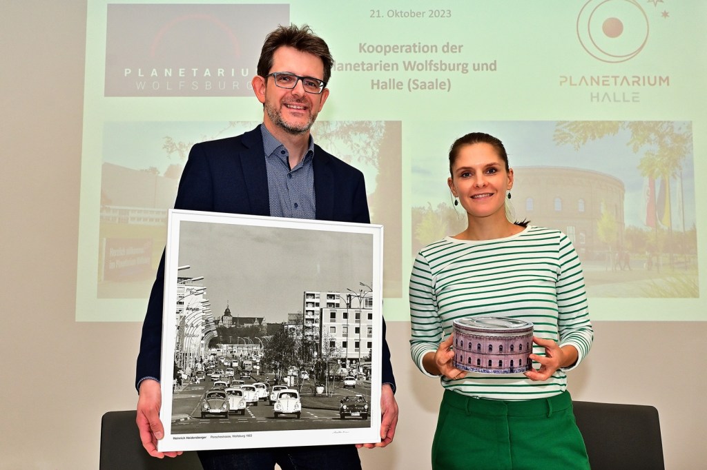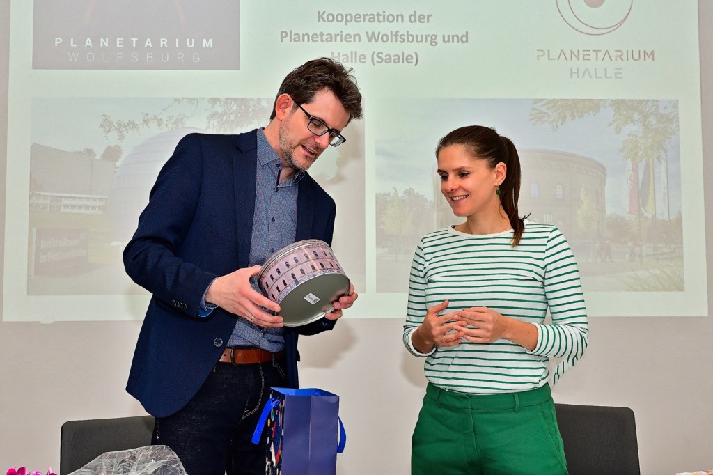 Eileen Pollex, die Leiterin des Wolfsburger Planetariums, schloss sich Schlesiers Begeisterung an und betonte die vielfältigen Möglichkeiten, die sich durch diese Kooperation eröffnen: „Um inhaltliche, wie formal-strukturelle Synergien zu schaffen, von gegenseitigen Erfahrungen zu profitieren und sich aktuellen Herausforderungen von Bildungs- und Kulturbetrieben zu stellen, ist eine Kooperation in vielerlei Hinsicht mit dem Planetarium Halle und seinem himmlischen Team eine großartige Idee.“