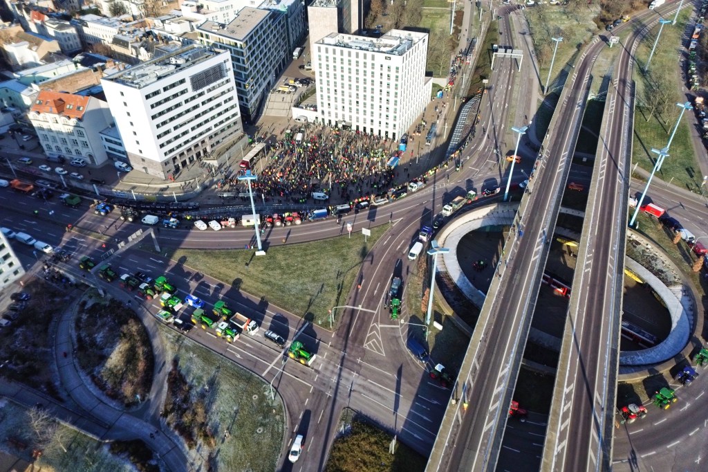 Unter dem Motto „Zu viel ist zu viel“ versammelten sich mehr als 1.000 Demonstrierende aus der Region auf dem verkehrsreichsten Ort der Stadt, dem Riebeckplatz, um gegen die geplante Streichung von Subventionen zu demonstrieren. Die Protestaktion, die um 11:00 Uhr begann, hatte nicht nur 1.000 Teilnehmer, sondern auch 200 Traktoren und Lastwagen angemeldet, die die zentrale Verkehrsader lahmlegten.