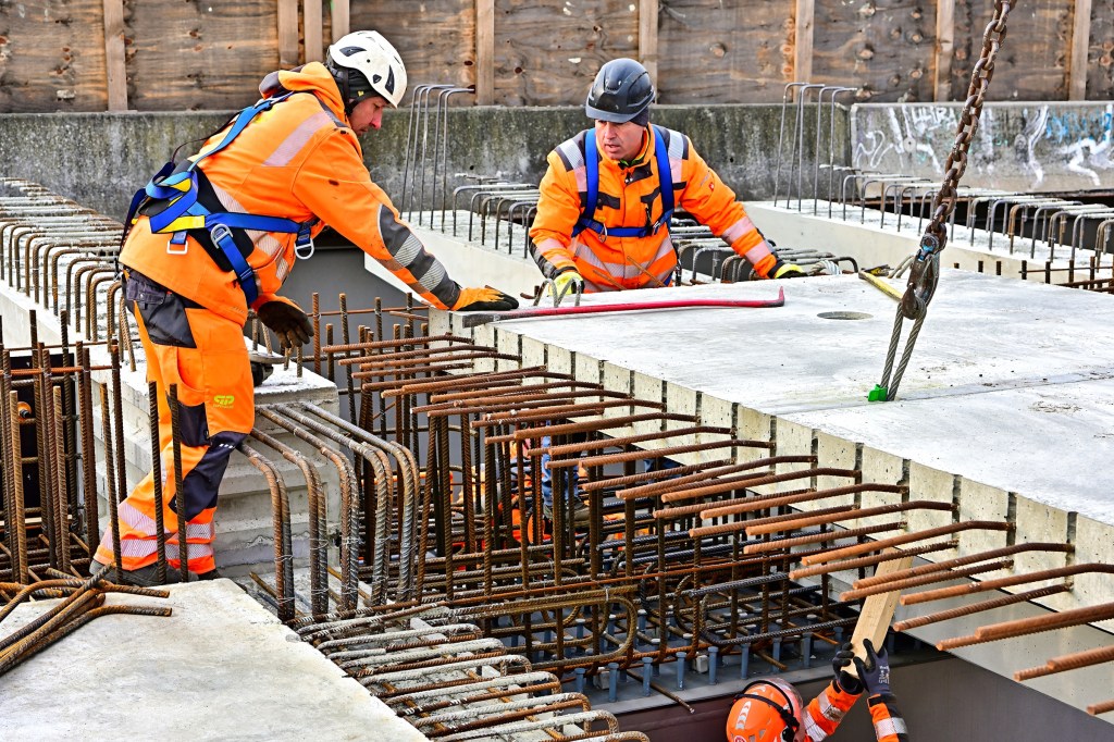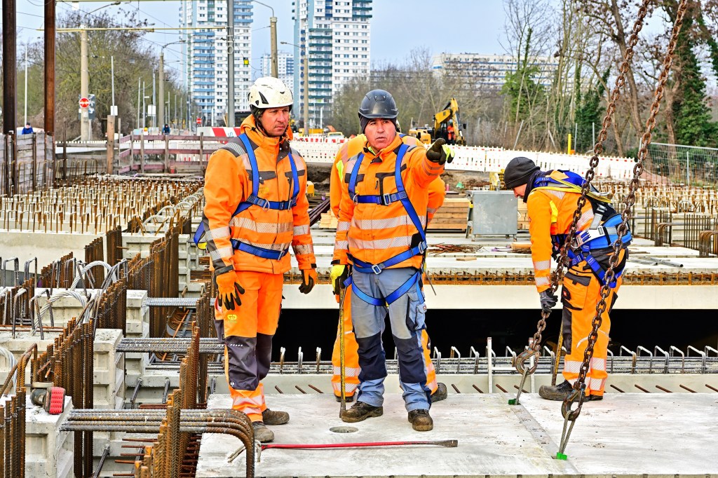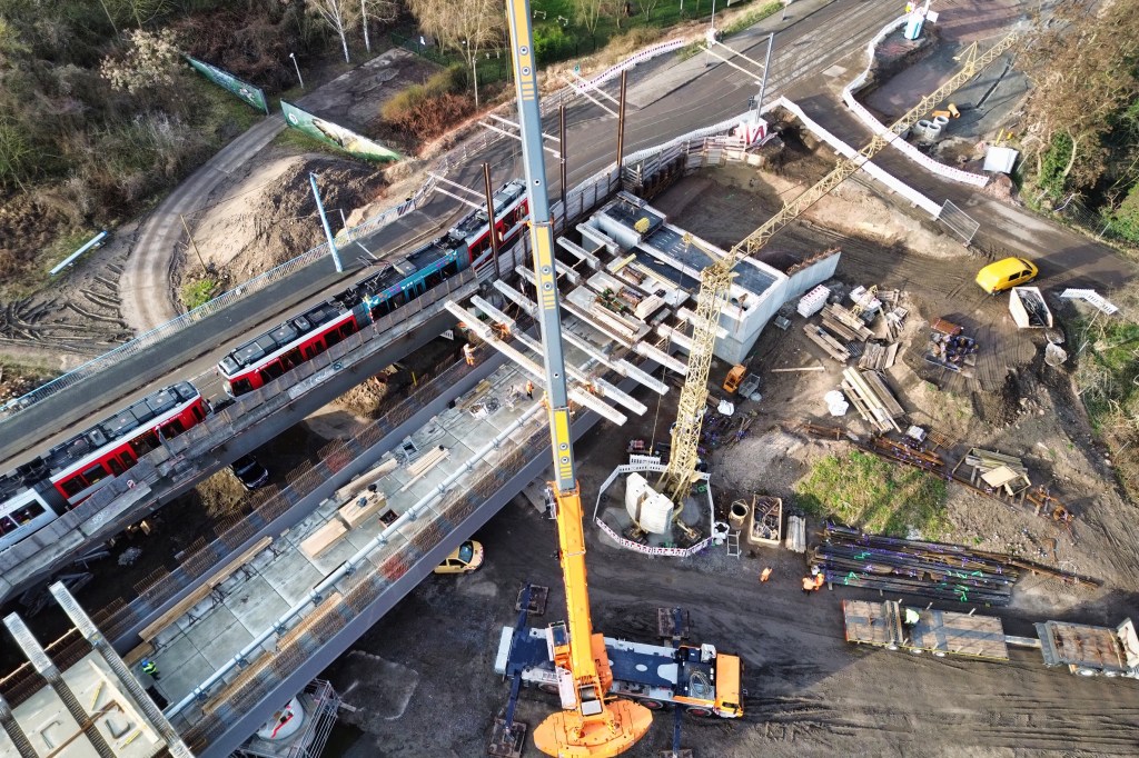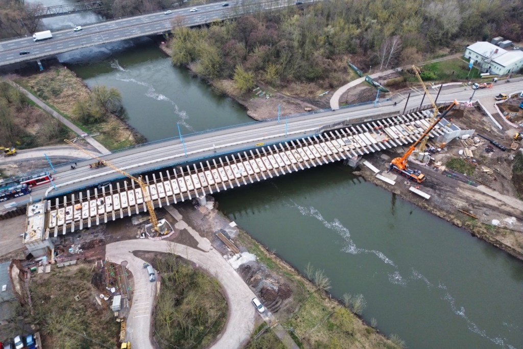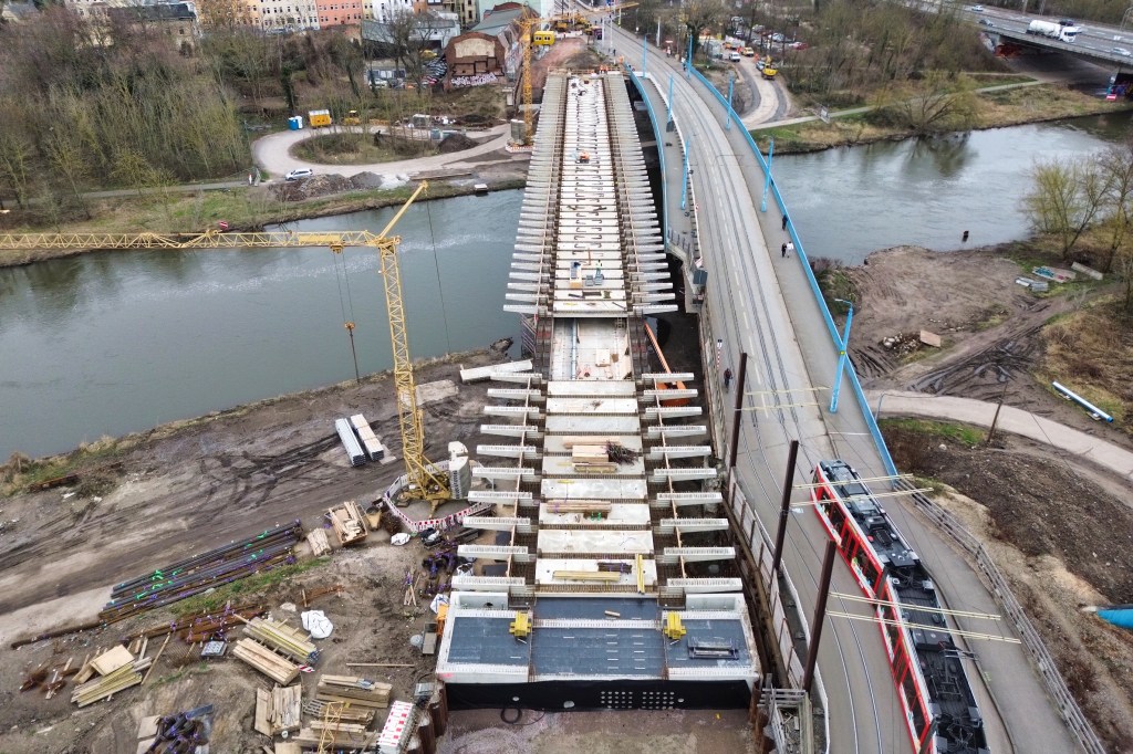 Gestern wurden auf der neuen Brücke über die Saale die letzten Querträger eingebaut und Fahrbahnplatten eingesetzt. Damit ist ein nicht geringer Meilenstein beim Brückenneubau der Elisabethbrücke erfolgt. Derzeit werden Verschalungen verbaut, zur Vorbereitung weiterer Betonierarbeiten. Auf der Westseite und Ostseite werden außerdem umfangreiche Arbeiten zur Verlegung neuer Gleisanlagen durchgeführt. Dennoch läuft parallel dazu planmäßig der Straßenbahnverkehr als wichtiger Bestanteil des öffentlichen Nahverkehrs und Verbindung zwischen der Altstadt und Halle-Neustadt. Das Projekt Elisabethbrücke ist Teil des Stadtbahnprogramms „STADTBAHN“ Halle.
