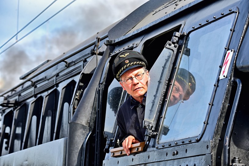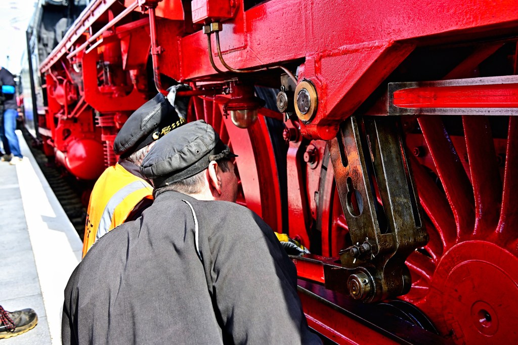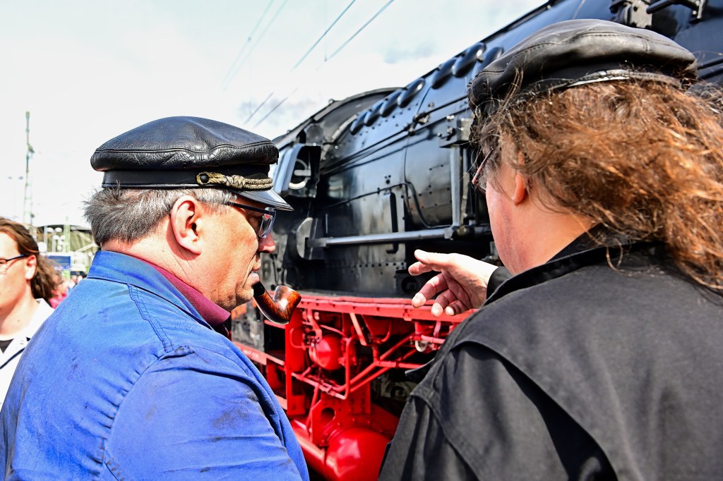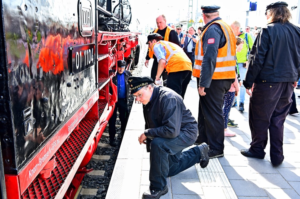 Unmittelbar nach dem Halt am vorgesehenen Punkt am Gleis7 bemühte sich eine Gruppe von „Reichsbahnern“ um ihre beiden Lokomotiven. Schließlich haben diese historischen Maschinen bereits einige Jahrzehnte hinter sich und bedürfen daher einer intensiven Betreuung. Das Überprüfen der Temperaturen, die Inspektion beweglicher Teile und das Nachfüllen von Öl gehörten zu den routinemäßigen Handgriffen, die von den Experten ausgeführt wurden. Und wer mit einer alten Dampflok unterwegs ist und auf Tradition setzt, trägt natürlich eine echte alte und abgewetzte „Reichbahner-Mütze“.