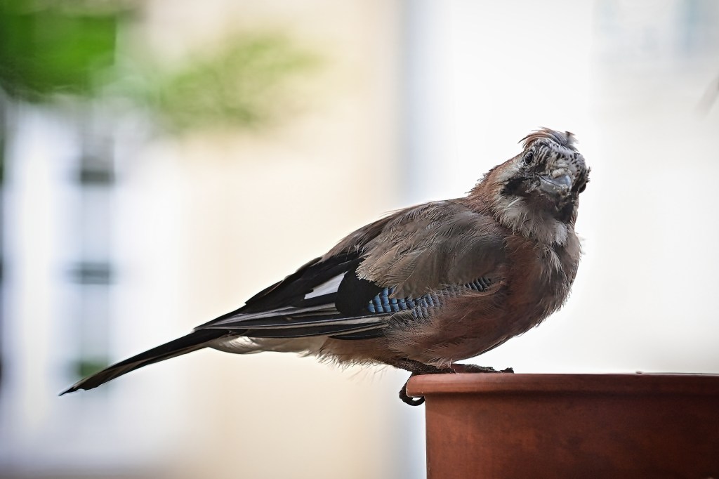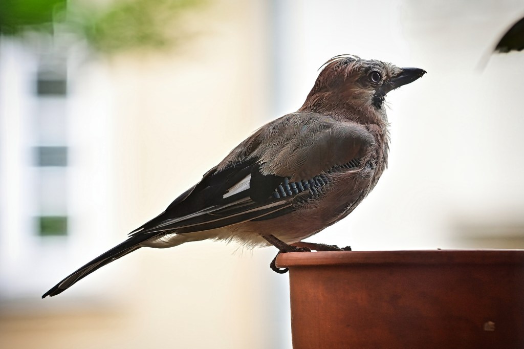 Ein Besucher [Eichelhäher], der mich mehrfach am Tag besucht und sein Futter abholt!