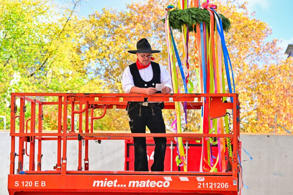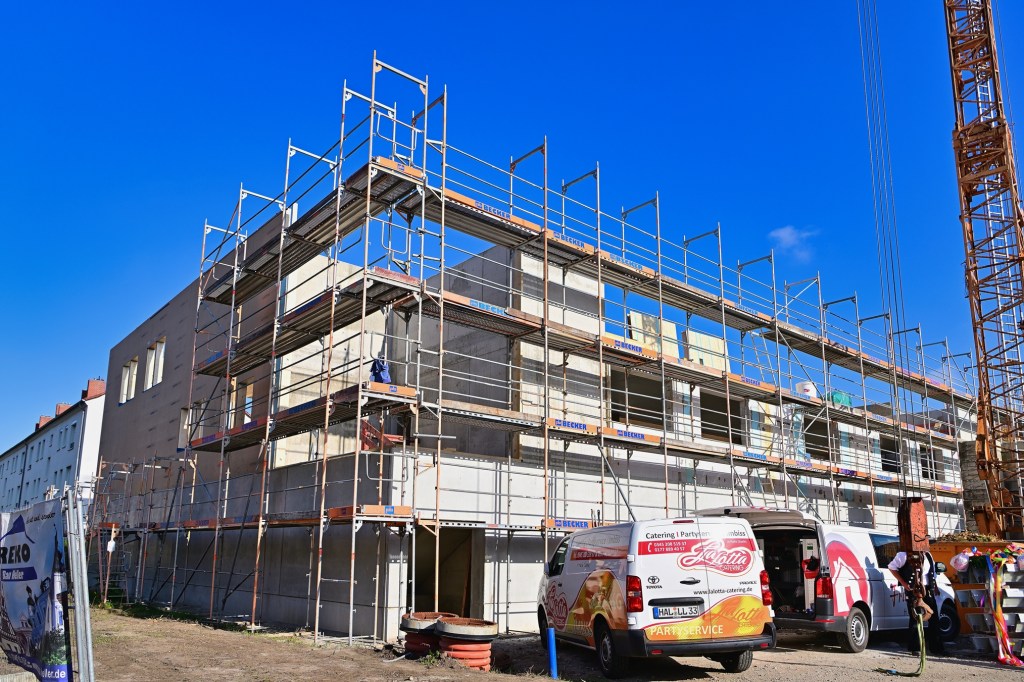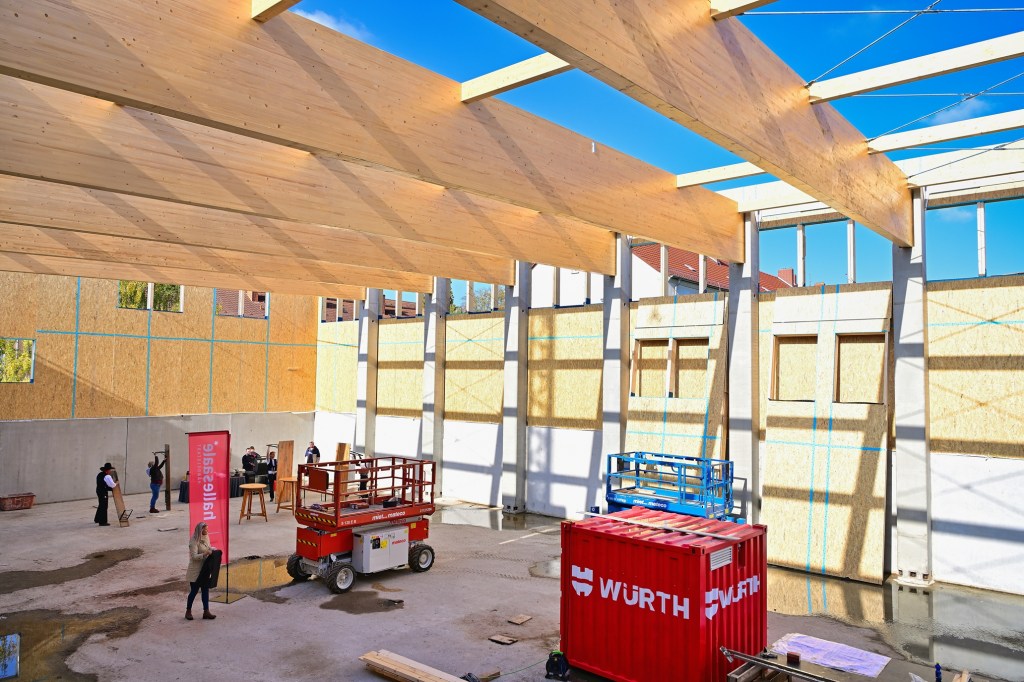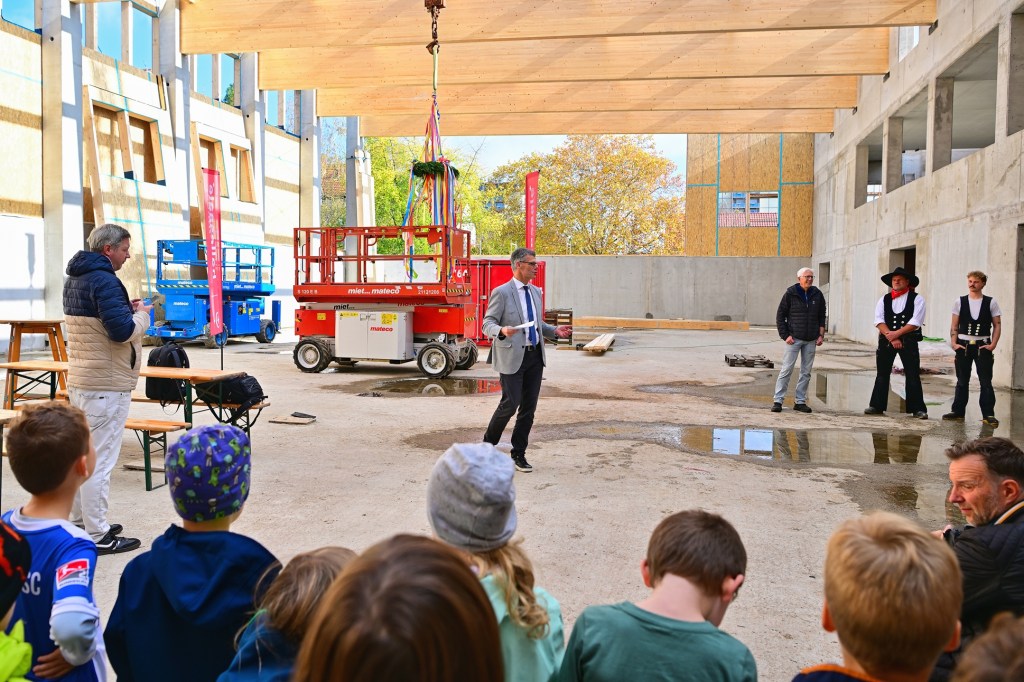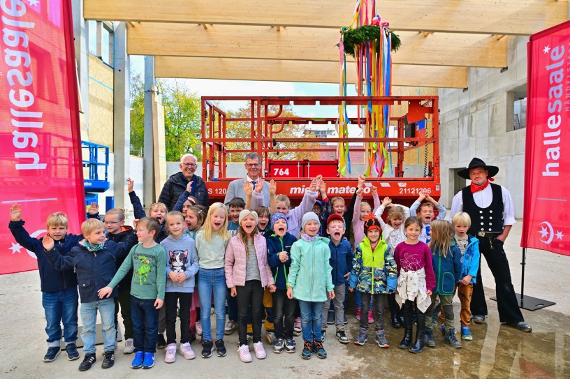 Heute fand an der Grundschule „Auenschule“ im Süden der Stadt Halle ein bedeutendes Ereignis statt, ein traditionelles Richtfest für den Neubau einer modernen Sporthalle. Zahlreiche neugierige Grundschüler waren gekommen, um den feierlichen Anlass mit ihren Lehrern und Eltern zu verfolgen und stellten dabei viele Fragen über das neue Gebäude.