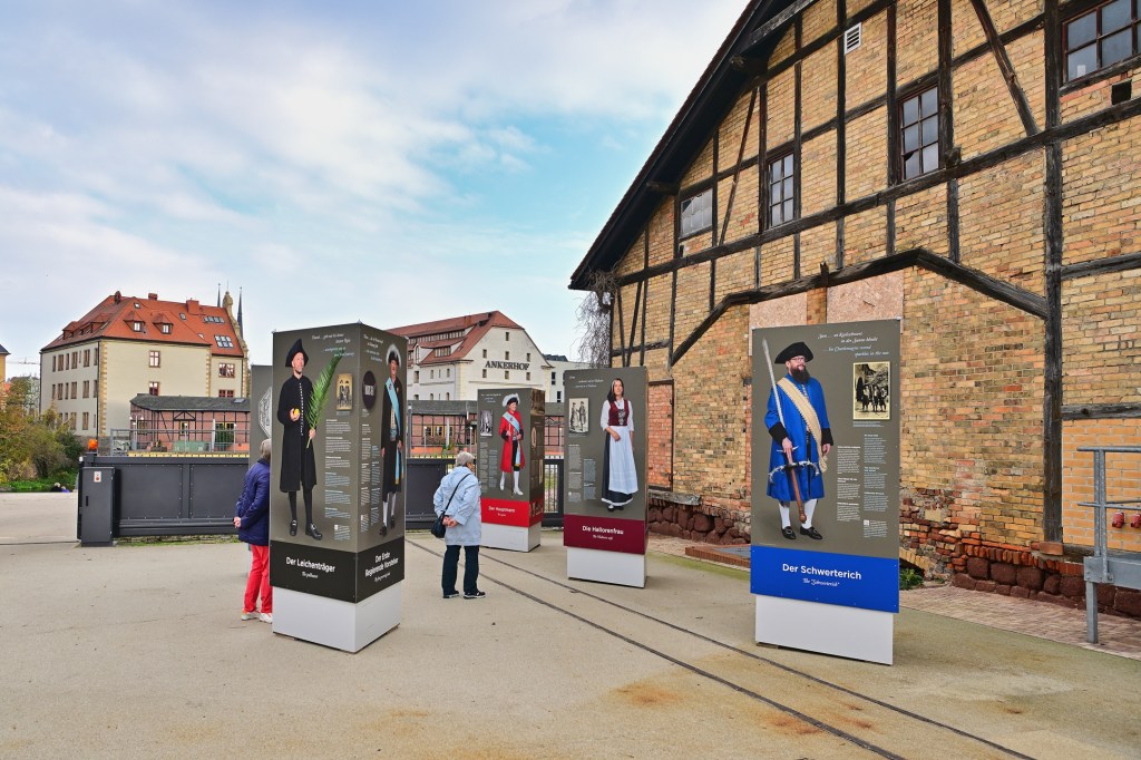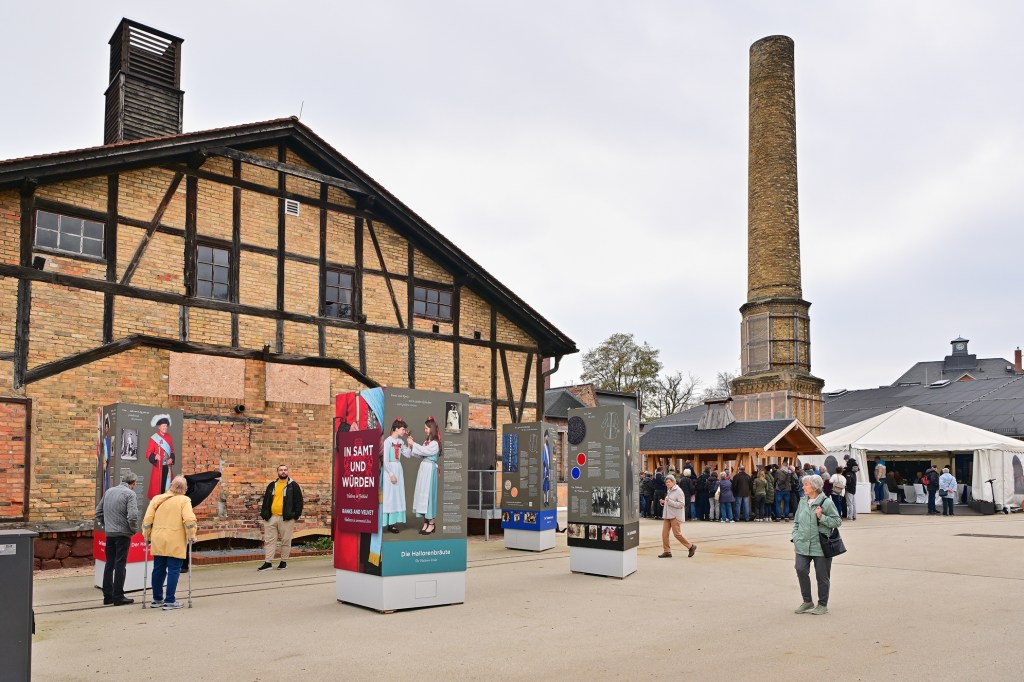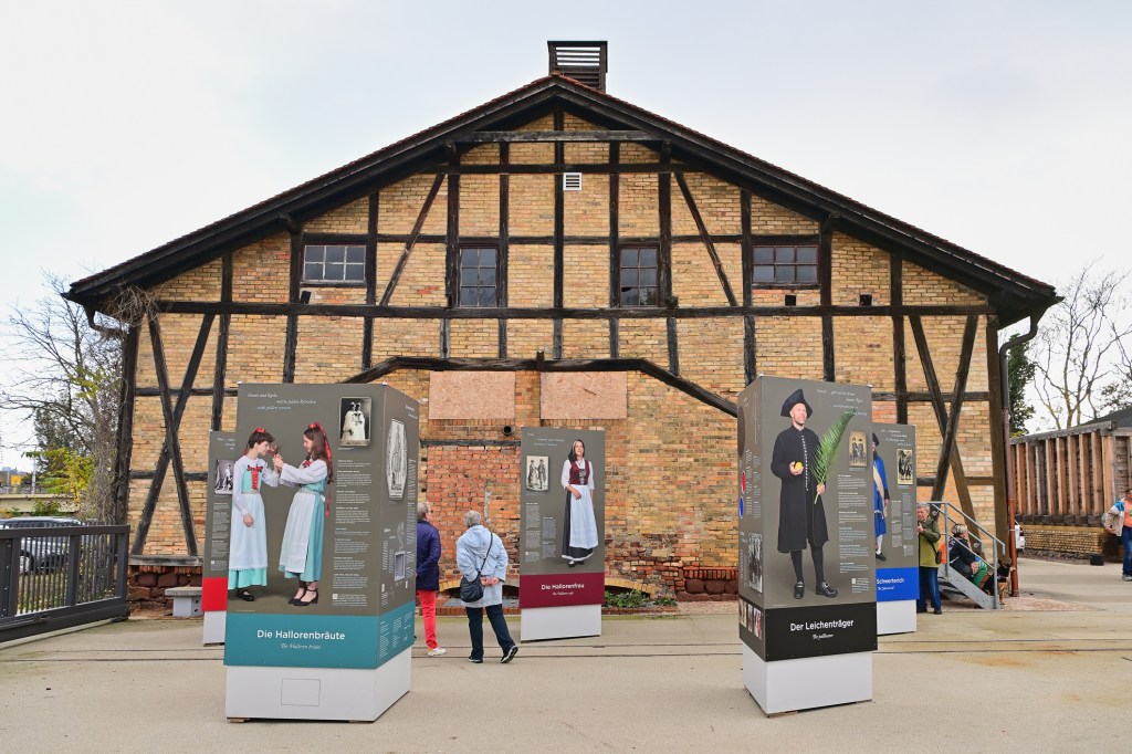 Neben dem Schausieden wurde die Ausstellung „In Samt und Würden – Halloren im Festkleid“ präsentiert. Stelen auf dem Salinehof zeigen eindrucksvoll die besonderen Festgewänder der Halloren und geben Einblick in die Kleidungstradition der Bruderschaft. Dabei handelt es sich um wertvolle und prunkvolle Kleidungsstücke, die oft nur zu besonderen Anlässen getragen werden. Die Exponate und Schautafeln informierten darüber, wie die festliche Kleidung des Salzgrafen und seiner Brüder in Szene gesetzt wurde und welche Details die Würde und Ehre dieser einzigartigen Gemeinschaft zum Ausdruck bringen.