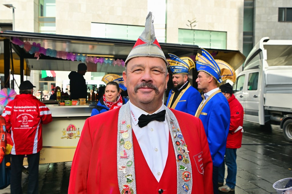 Vor dem historischen Ratshof herrschte ausgelassene Stimmung, als Karnevalsvereine aus Halle und dem Saalekreis, organisiert im HSKV (Hallescher Karnevalsverein Saalkreis e.V.), ein abwechslungsreiches Programm präsentierten. In fantasievollen Kostümen traten die Akteure auf, boten Tanzvorführungen die das Publikum zum Lachen und Schunkeln brachten. Hunderte Zuschauer verfolgten das Spektakel und belohnten die Darbietungen mit tosendem Applaus.
