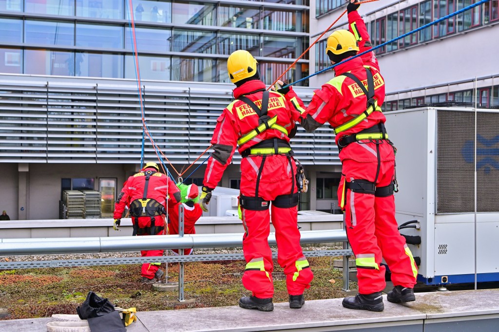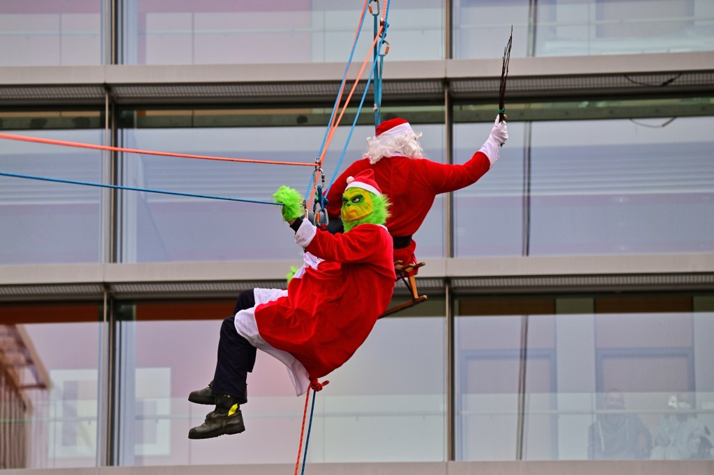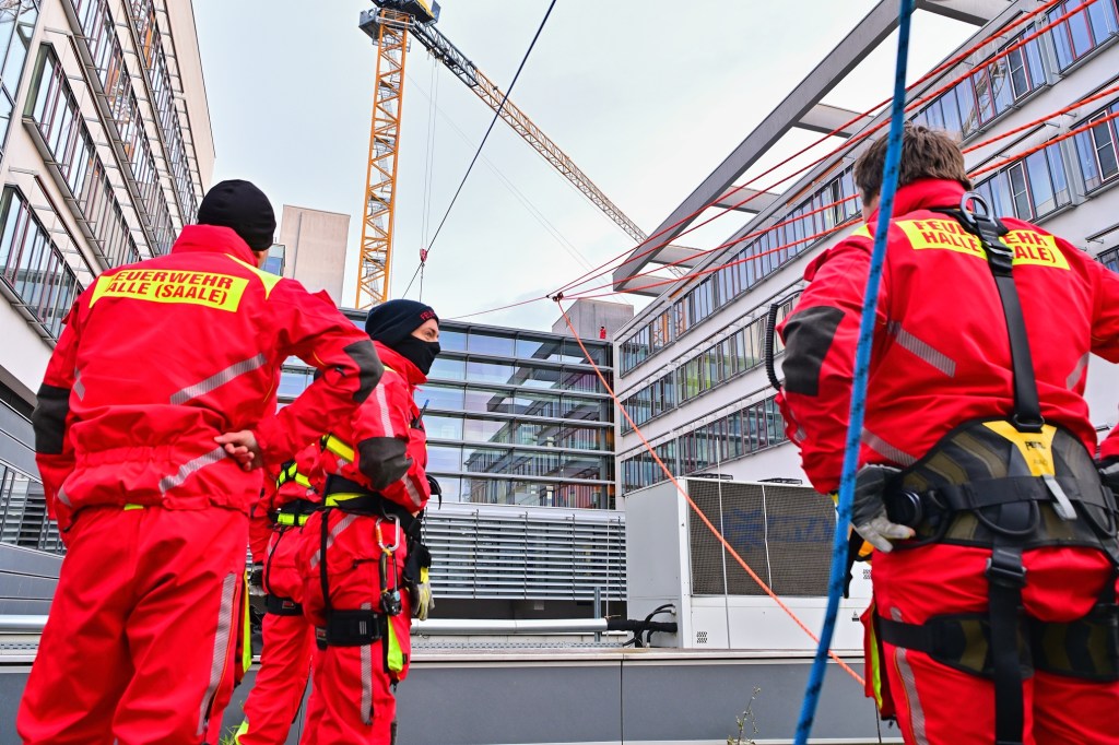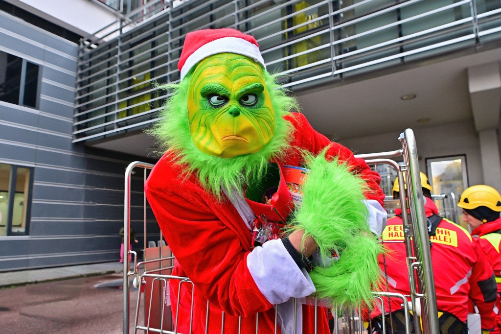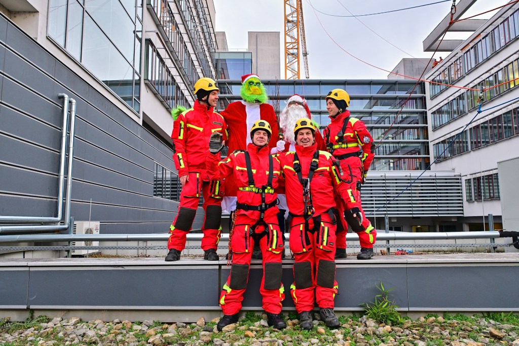 Das ist sicher nicht alltäglich, was die kleinen Patienten der Kinderstation im Universitätsklinikum Kröllwitz zu sehen bekommen. Es ist eben bald Weihnachten und da kommt der Weihnachtsmann, begleitet vom Grinch als Überraschung auch schon mal vom Dach. Professionell wurde die Aktion von den Höhenrettern der Berufsfeuerwehr Halle durchgeführt, wobei die Sicherheit absolute Priorität hatte.