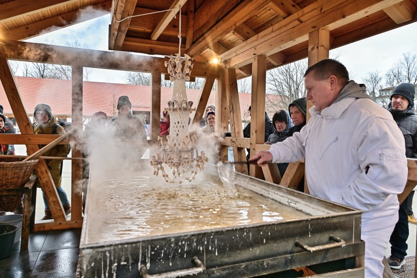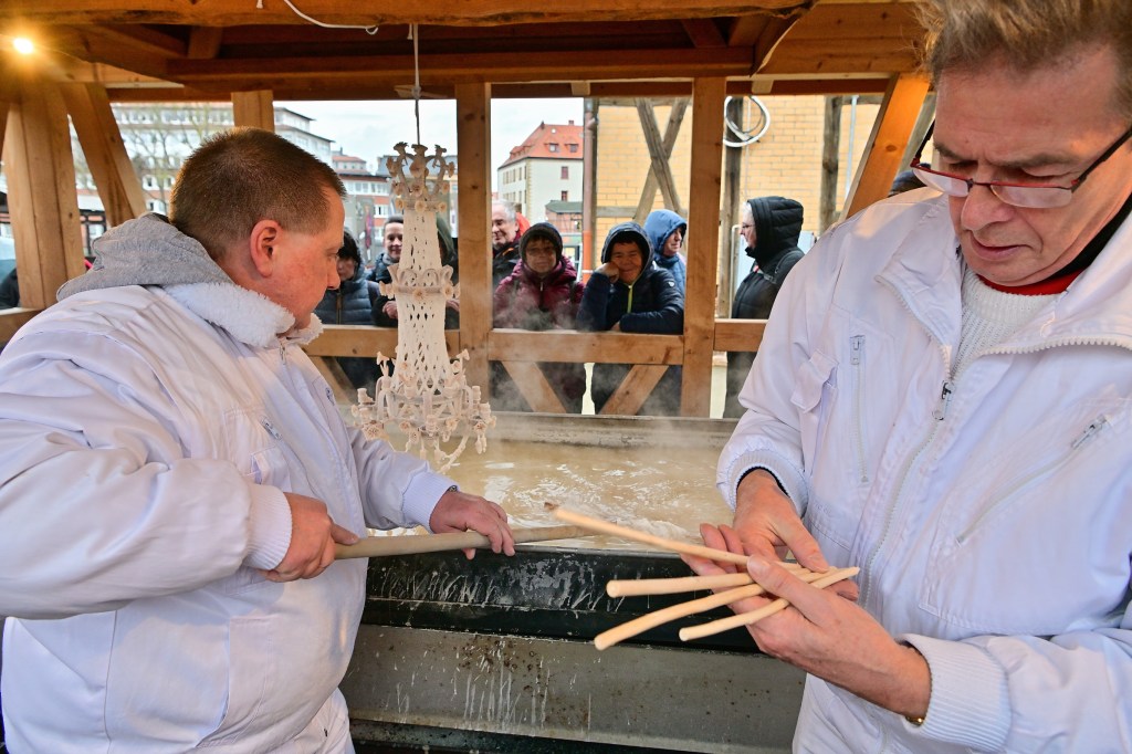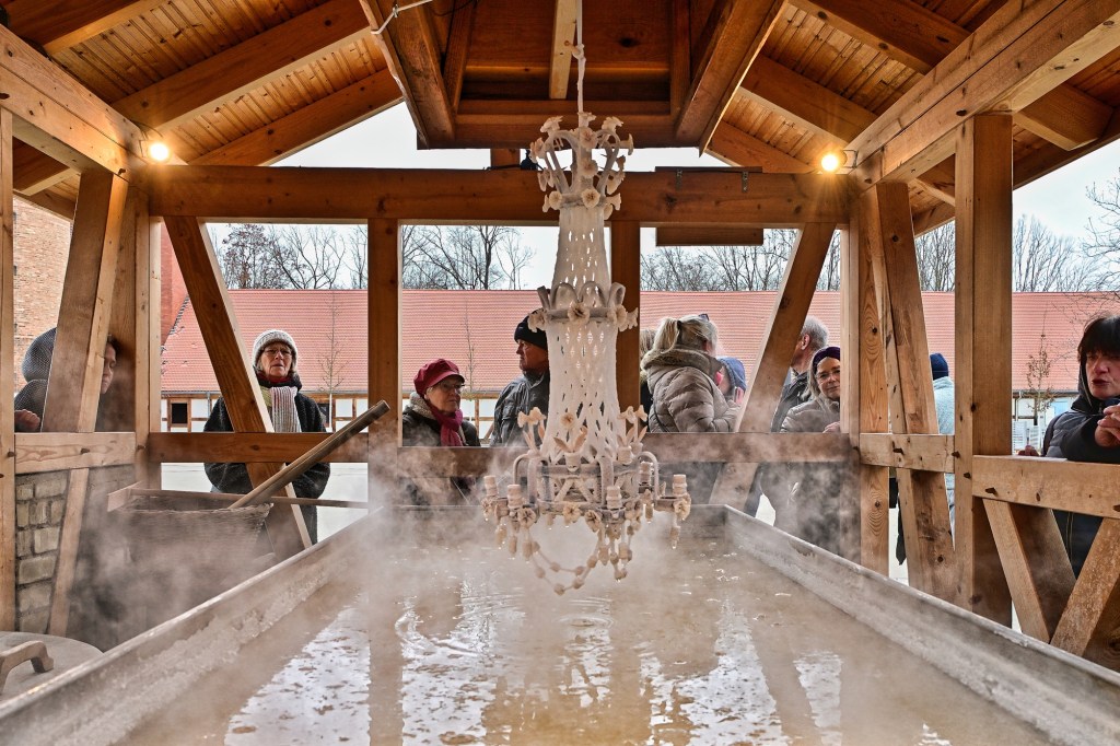 Es war heute das letzte Schausiedenin diesem Jahr auf dem Hof der Saline. An der Siedepfanne hatten sich wieder viele Gäste aus nah und fern eingefunden, um das traditionelle Schausieden aus nächster Nähe zu verfolgen. Und es war heute auch ein Höhepinkt, denn seit langer Zeit wurde wieder ein sogenannter „Salzkronleuchter“ angefertigt. Ein solcher Kronleuchter ist in seiner Herstellung sehr aufwendig und verlangt viel Erfahrung und Geschick.