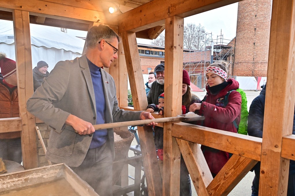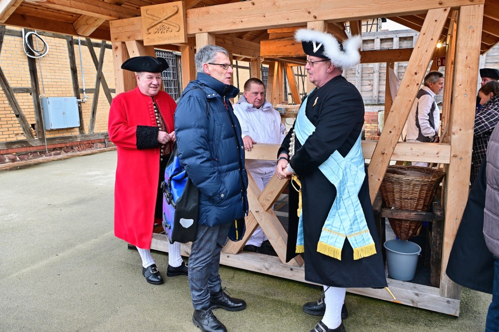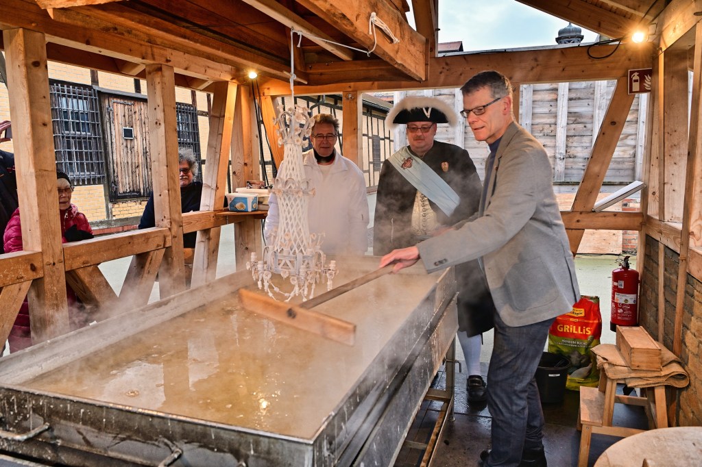 Bürgermeister Egbert Geier war auch zu Besuch und bekam gleich eine Lehrstunde in Sachen Salz sieden. Er gab sich sichtlich große Mühe, aber da gibt es noch Reserven. Der erste und regierende Vorsteher der Halloren, Tobias Heinicke hat sich das alles genau angeschaut, korrigierend eingegriffen und wohlwollend beurteilt. Gelernt ist eben gelernt.