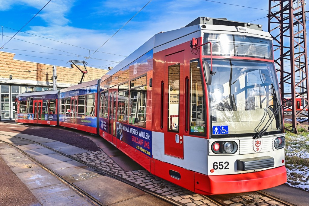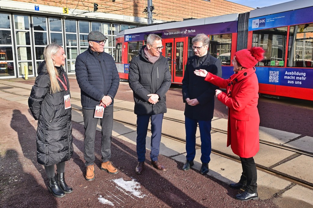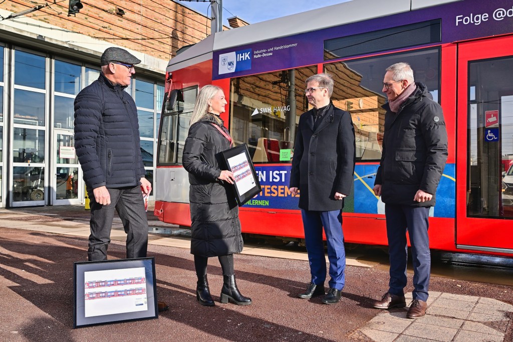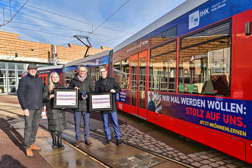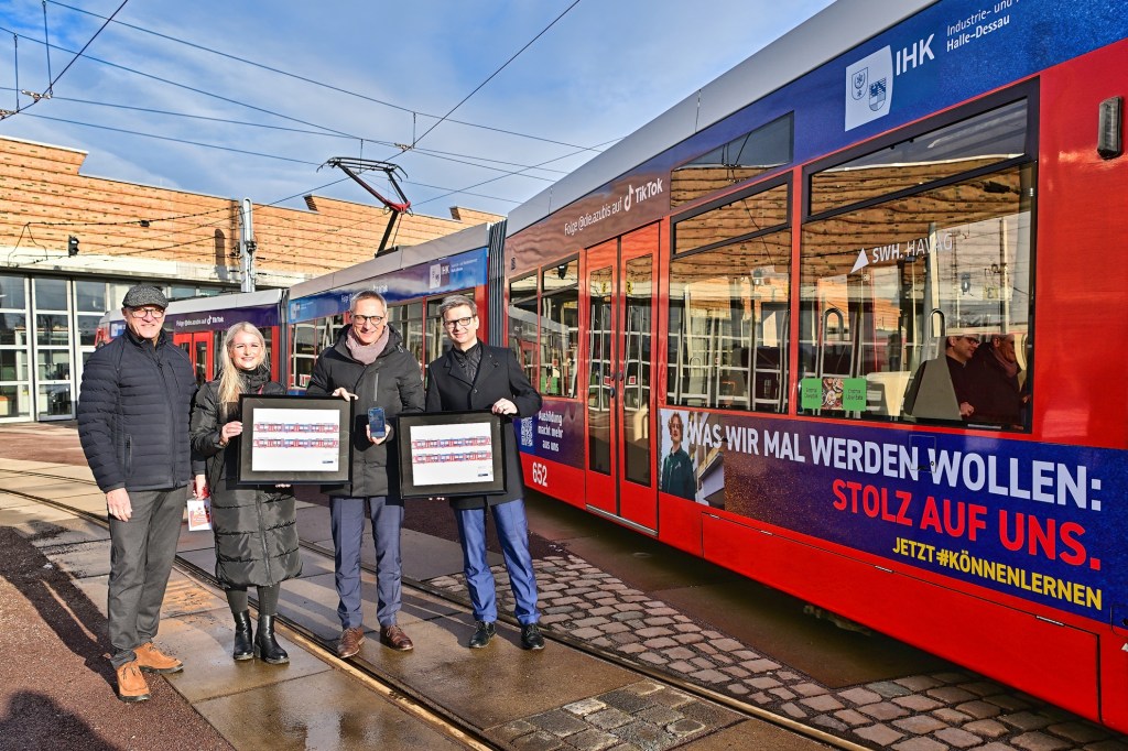 Die IHK Halle-Dessau unterstützt deshalb die bundesweite Ausbildungskampagne „Jetzt #könnenlernen“, mit großen Werbeträgern auf Straßenbahnen und Bussen. Im Straßenbahndepot der HAVAG, in der Freiimfelder Straße, wurde heute durch den IHK-Präsidenten Sascha Gläßer die Straßenbahn mit den gestalteten Werbeträgern vorgestellt.