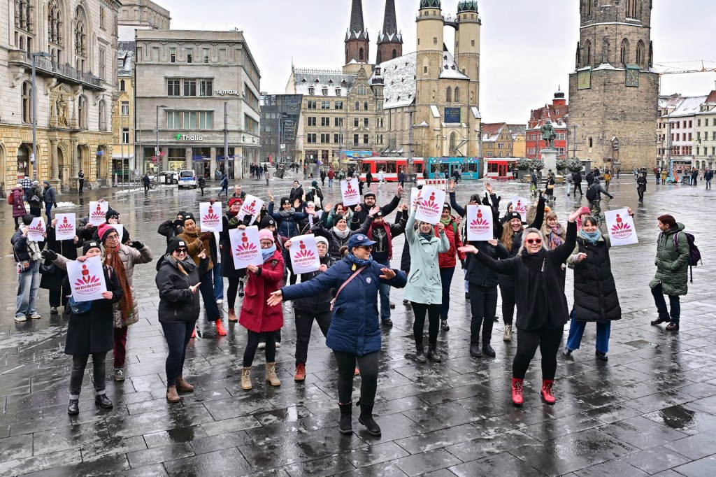 Auch in Halle hat der Flashmob ein starkes Zeichen gegen Gewalt an Frauen und Mädchen gesetzt. Die Teilnehmerinnen und Teilnehmer tanzten gemeinsam und machten so auf das wichtige Thema aufmerksam.