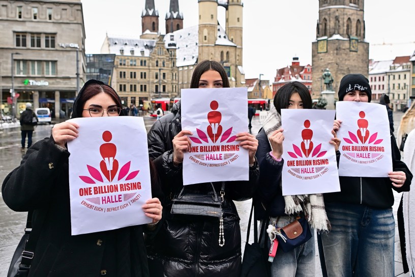 Am heutigen Vormittag fand vor dem Ratshof in Halle ein Flashmob im Rahmen des weltweiten Aktionstags „One Billion Rising“ statt. Zahlreiche Frauenprojekte und -initiativen aus der Region beteiligten sich an der Protestaktion gegen Gewalt an Frauen und Mädchen.