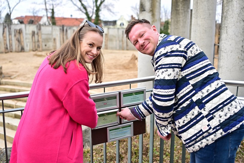 Neben einem Bild von Pori, dass vom Zooverein Halle an die Paten überreicht wurde, ging es dann zum Außengehege. Dort konnten die Vertreter des Therapiezentrums eine Informationstafel mit ihren Namen anbringen. So können Zoobesucher sehen, dass es in Halle viele Unterstützer des Zoos gibt, die sich durch finanzielle Zuwendungen engagieren.