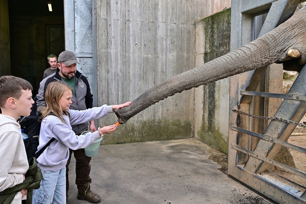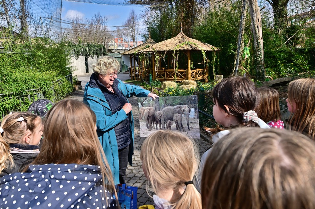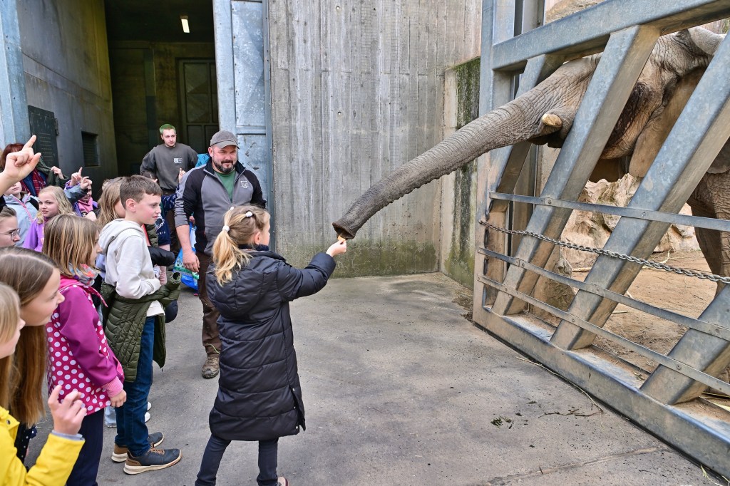 Bevor es zum Elefantenhaus ging, informierte Frau Schneider vom Zooverein die Kinder über die Elefantenherde und stellte Simon vor. Die Aufregung war groß, denn ein Besuch so nah am Elefantengehege ist für die meisten Zoobesucher eine Seltenheit. Die Kinder waren beeindruckt, als sie nur wenige Meter von den riesigen Tieren entfernt standen und sogar Leckerlis füttern durften.