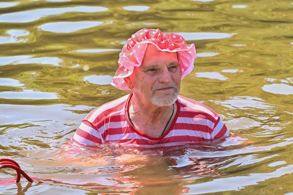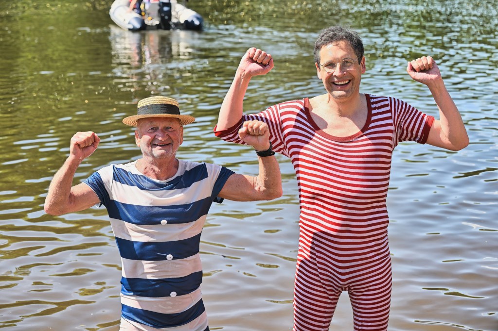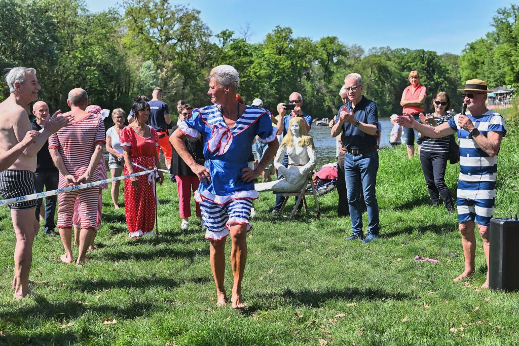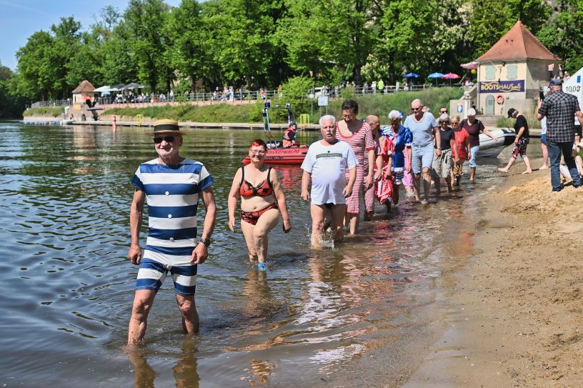 Doch im Mittelpunkt stand das traditionelle Wassertreten und Anschwimmen selbst. Die Ziegelwiese, ohnehin ein beliebter Anlaufpunkt für Freizeitaktivitäten direkt an der Saale, bot die perfekte Kulisse für dieses alljährliche Spektakel. Neben zahlreichen Schaulustigen versammelten sich 52 unerschrockene Schwimmerinnen und Schwimmer in ihren farbenfrohen Badeanzügen und Badehosen. Ein besonderer Hingucker in diesem Jahr: viele Teilnehmer hatten sich modisch in die Vergangenheit versetzt und präsentierten stolz quer- und längsgestreifte Modelle, die an die Bademode vor rund 100 Jahren erinnerten.