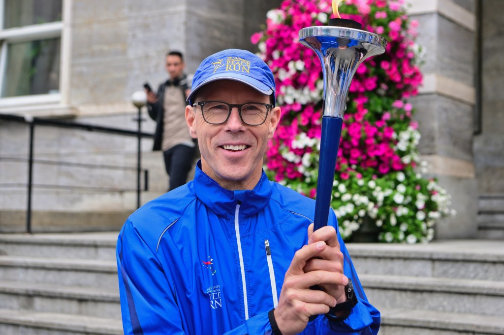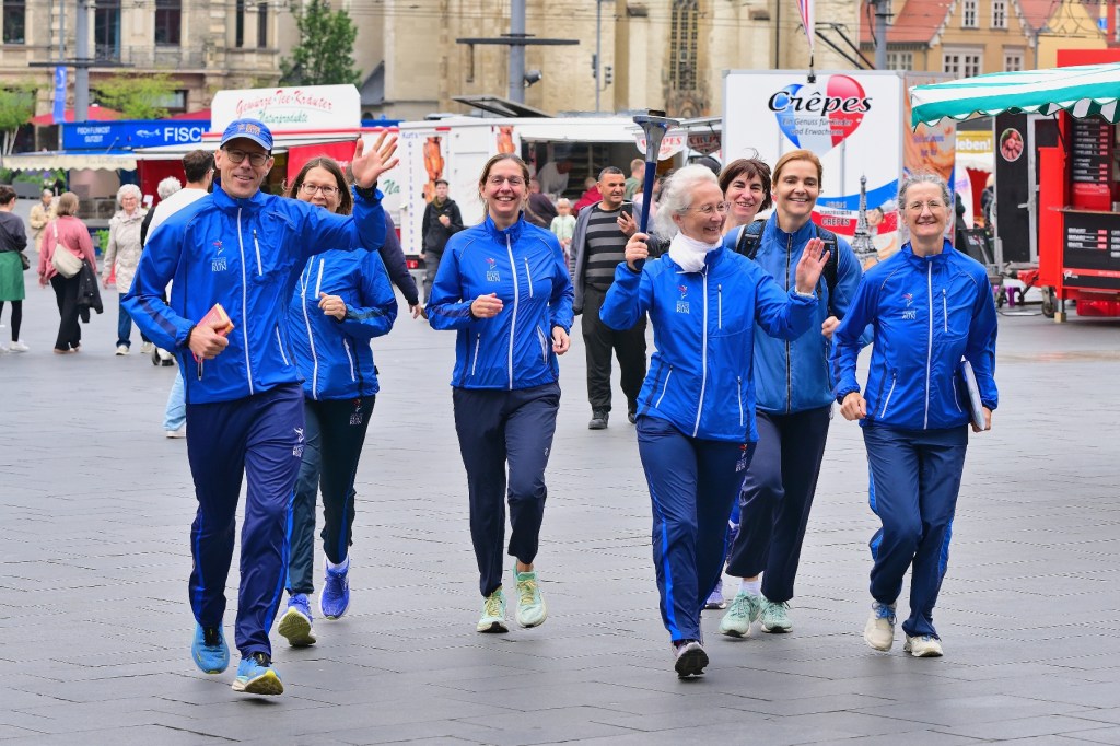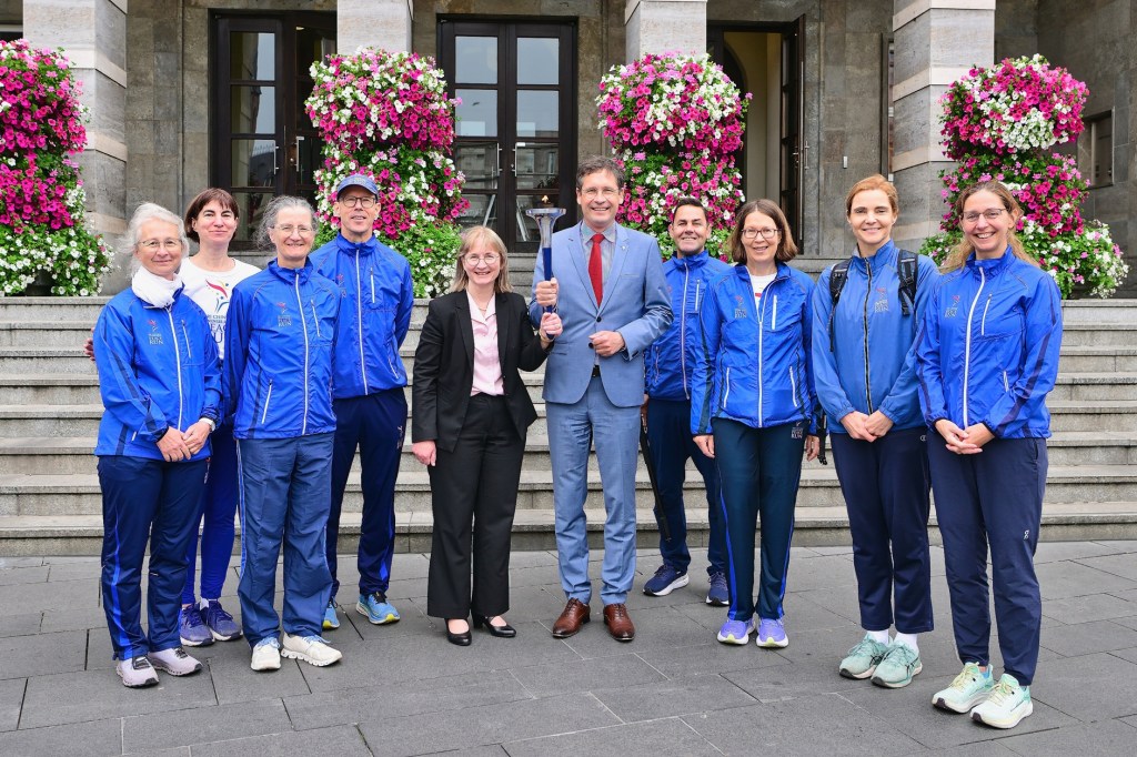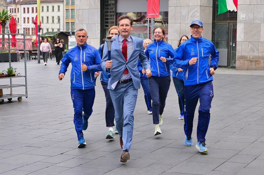 Der Höhepunkt des Empfangs war zweifellos der Moment, als Oberbürgermeister Dr. Alexander Vogt die Friedensfackel selbst in die Hand nahm. Er ließ es sich nicht nehmen, mit den Läuferinnen und Läufern eine gemeinsame Runde über den historischen Marktplatz zu absolvieren. Diese symbolträchtige Geste des Stadtoberhauptes unterstrich die Wertschätzung für die weltweite Friedensinitiative und die Bedeutung ihrer Botschaft für die Stadt Halle.