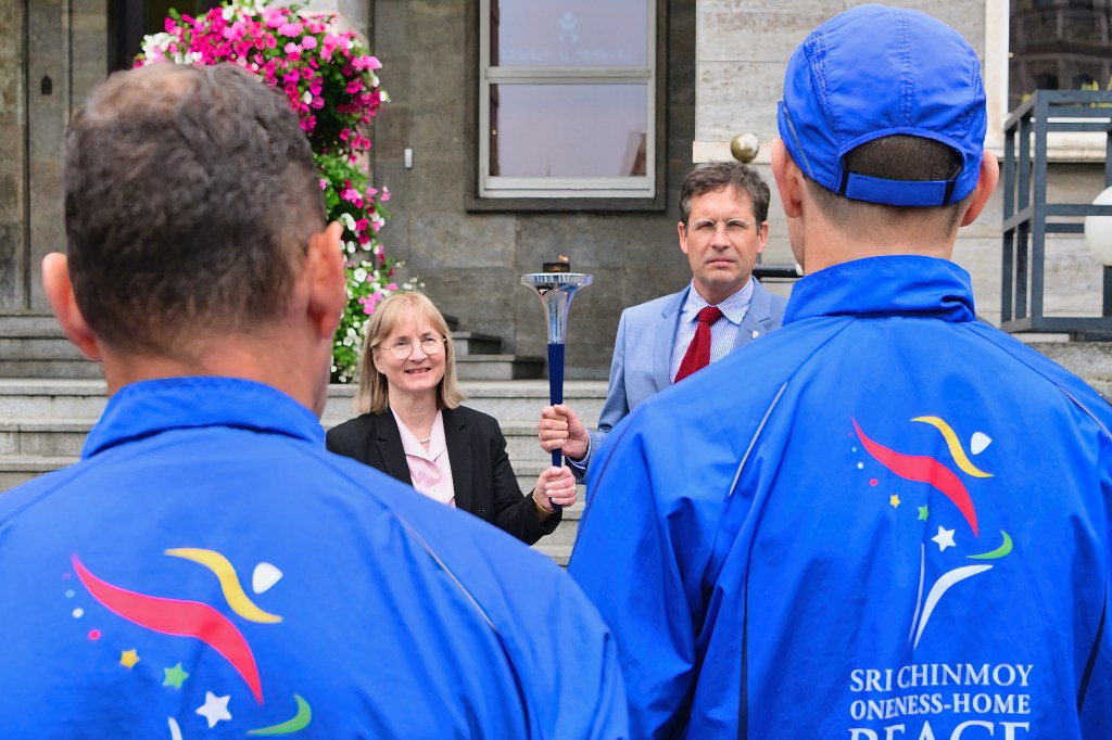 Ein Hauch von globaler Einheit und Friedensbotschaft wehte heute in Halle. Ein internationales Läuferteam des Sri Chinmoy Oneness-Home Peace Run, des weltweit längsten Staffellaufs mit einer Friedensfackel, machte Station in der Saalestadt und wurde vor dem Ratshof feierlich von Oberbürgermeister Dr. Alexander Vogt und der Beigeordneten für Kultur und Sport, Dr. Judith Marquardt, empfangen.
