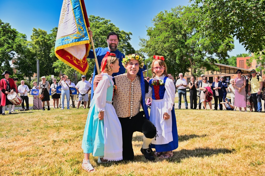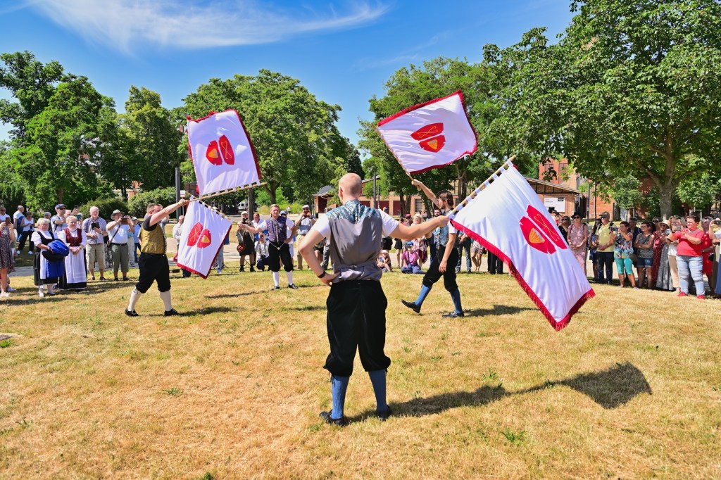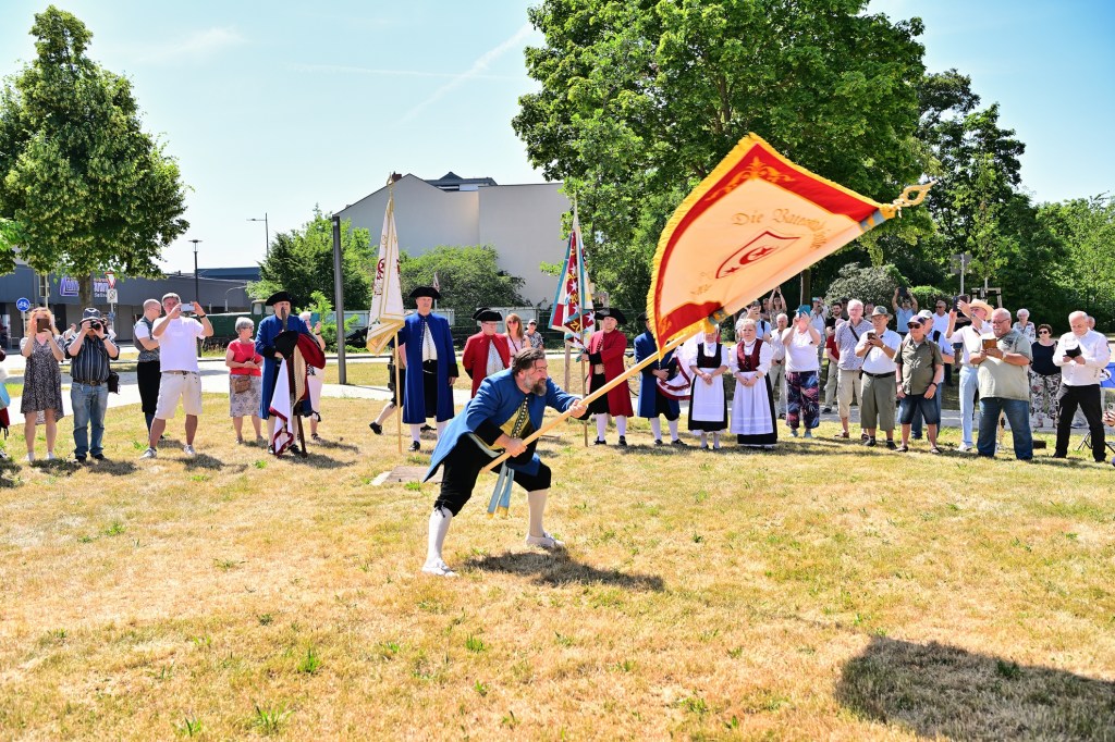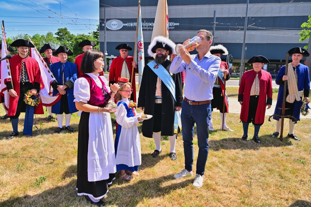 Ein Höhepunkt des Festes, der stets für große Begeisterung unter den zahlreich erschienenen Zuschauern sorgt, ist das „Fahnenschwenken“ und der darauf folgende „Zappeltanz“. Während die Tänzer in ihren traditionellen Festkleidern – eine Herausforderung bei sommerlichen 30 Grad – viel Durchhaltevermögen bewiesen, fand auch ein besonderer Programmpunkt statt: Oberbürgermeister Dr. Alexander Vogt übernahm das „Friedewirken“ für das Fest.