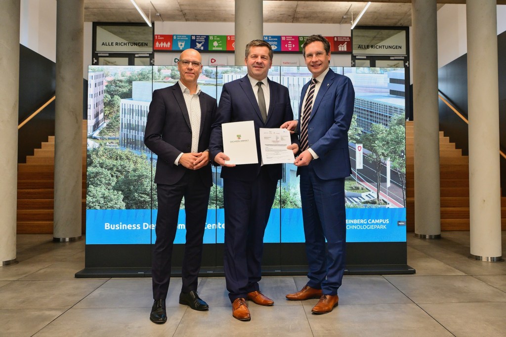 Sachsen-Anhalts Wirtschaftsminister Sven Schulze übergab den Bewilligungsbescheid im feierlichen Rahmen des „Innovation Hub“ an Oberbürgermeister Dr. Alexander Vogt und an Dr. Ulf-Marten Schmieder, den Geschäftsführer des Technologiepark Weinberg Campus.