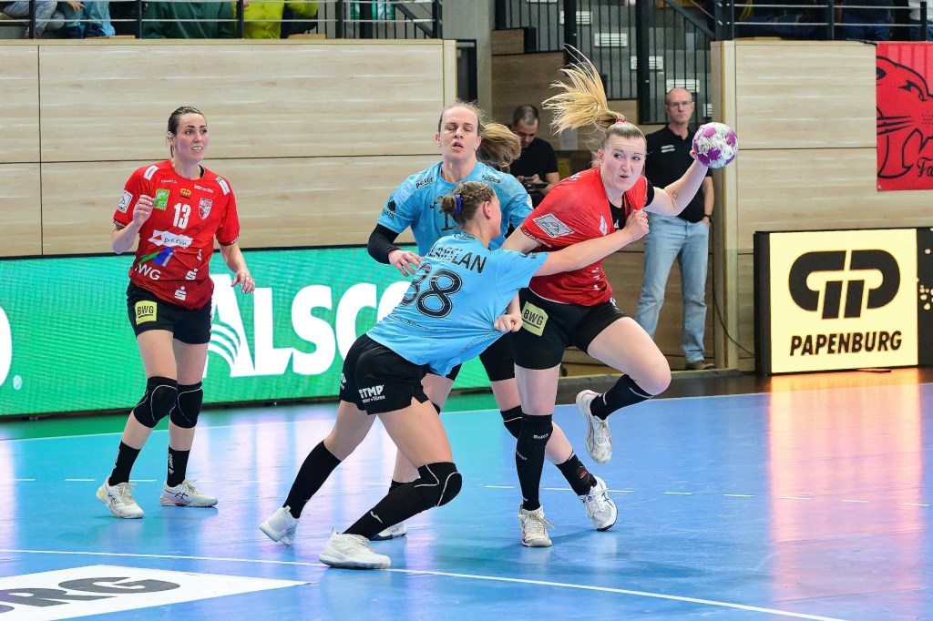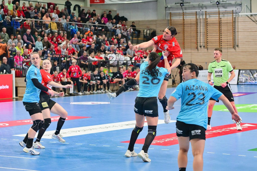 Dass in diesem Derby die Defensivreihen nicht im Fokus stehen würden, deutete sich früh an. Während die Gäste aus Thüringen den besseren Start erwischten, kämpften sich die WildCats aus Halle mit viel Energie zurück in die Partie. Getragen von einer überragenden Cara Reuthal, die mit insgesamt 13 Treffern zur besten Torschützin der Partie avancierte, gelang in der 15. Minute der verdiente 9:9-Ausgleich.