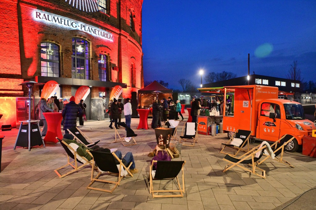 Doch nicht nur der Geist wurde gespeist. Im Außenbereich herrschte bei Musik, heißen Getränken und Herzhaftes vom Grill echte Volksfestatmosphäre, und das bei Minusgraden. Der Kontrast zwischen der hochmodernen Architektur des Planetariums und der bodenständigen Geselligkeit verlieh dem Abend eine besondere Note